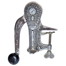 Original Safety corkscrew, made in England, nickel plated ornately cast iron, all original, made to clamp on counter, 9"H.