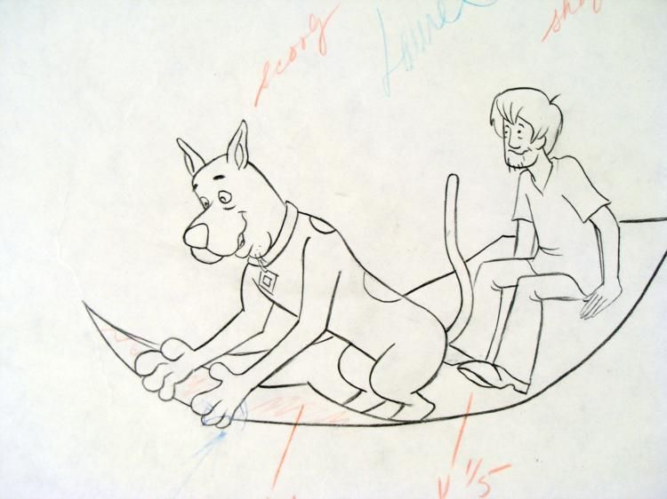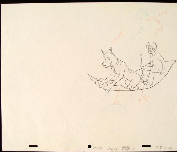 Each episode featured Scooby and the four teenaged members of the Mystery, Inc. gang: Fred, Shaggy, Daphne and Velma, arriving to a location in the "Mystery Machine" and encountering a ghost, monster, or other supernatural creature, who was terrorizing * the local populace. After looking for clues and suspects and being chased by the monster, the kids come to realize the ghost and other paranormal activity is actually an elaborate hoax, and - often with the help of a Rube Goldberg-like trap designed by Fred * - they capture the villain and unmask him. Revealed as a flesh and blood crook trying to cover up crimes by using the ghost story and costume, the criminal is arrested and taken to jail, often saying something to the effect of "...and I would have gotten away * with it, too, if it hadn't been for you meddling kids!" * * * * Here Scooby and Shaggy appear to be going on a magic carpet ride, away from all the mischief... * * * Original "rough" animation drawing, in black with the notations in black, non-photo blue, and red.Overall size is a 12-field drawing that is 10 1/2" × 12 1/2" * Excellent condition * Traditional animation is a multi-step process which includes various types of art techniques. Drawings are a key part of the process, in which the animator creates the design and movement of the characters. Drawings are then transferred onto acetate cels * (by hand-inking and/or photo copying) to create a production cel, which is then hand painted on the back side, using paint colors chosen and approved by the creator of the series. * * * * * The drawing is ready to be matted and framed. The animators notations are located at the top and bottom of the drawing. *