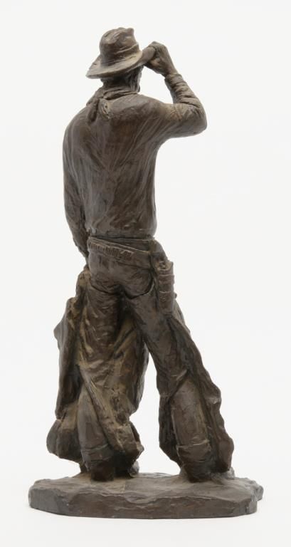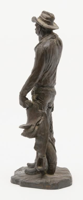 Original Sculpture (not bronze) cast metal-bronze finished probably spelter type material of a cowboy with Colt and rig, holding is saddle; copyright 1969 by Michael Garman, approx. 21” in height x 10-1/2” wide; nicely accomplished with great features in the cowboy’s face. Est.: $500-$1,000.