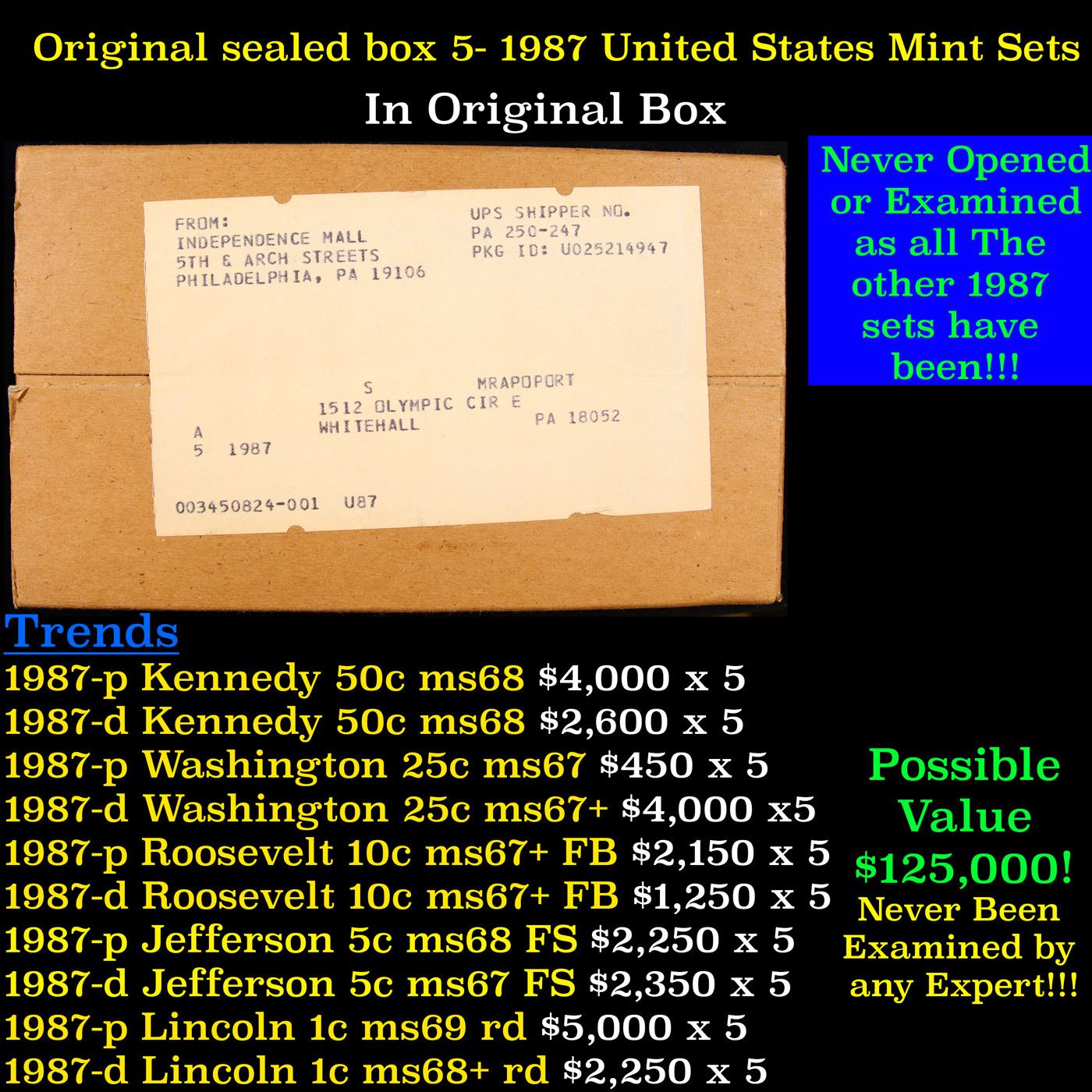 Original Sealed Box of 5-1987 Mint Sets. 1987 UNITED STATES MINT YEAR SETS ORIGINAL SEALED GOV PACKAGING - 5 SETS IN BOX