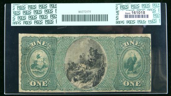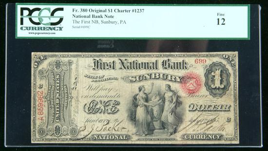 Original Series, $1 National Bank Note. The First NB, Sunbury, PA. PCGS Fine 12. . Fr-380. Large size notes from this bank are relatively common, but not so from the First Charter designs. In fact, this note that is new to the census is the first First Charter note from here reported. While moderately circulated, it is basically free of any problems and has excellent pen signatures of S.J. Packer and J.B. Packer. A terrific note for the Pennsylvania specialist, and an opportunity for a First Charter note on this bank that may not be available for many more years.