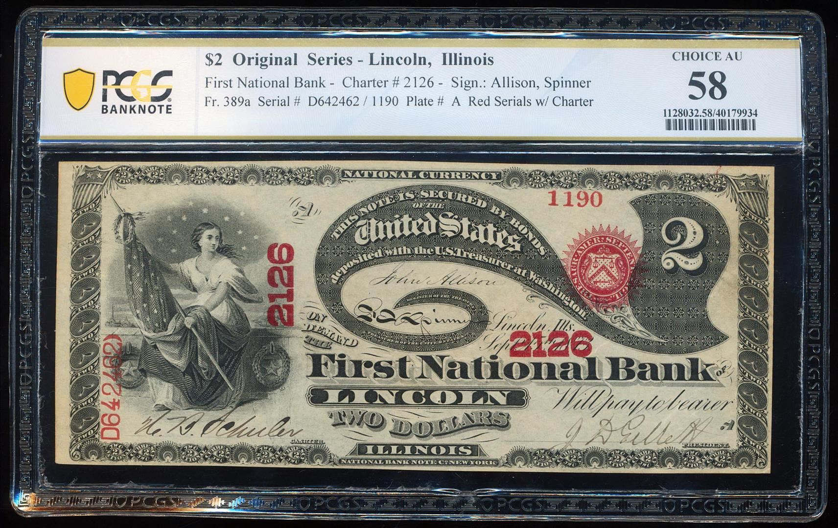 One Original Series $2 First NB Lincoln, IL CH# 2126 National Note PCGS Ch. About Unc 58. PCGS Graded.