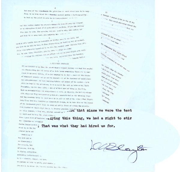 Boldly signed in blue ink at conclusion. Fine example. Accompanied by a signed statement by a colleague of Slayton’s who acquired it, that the manuscript was later incorporated into a book published about the Mercury missions.