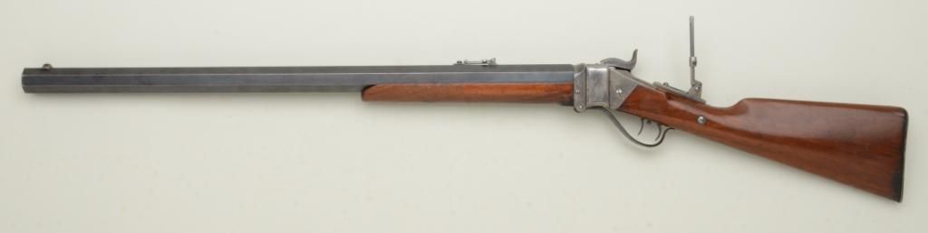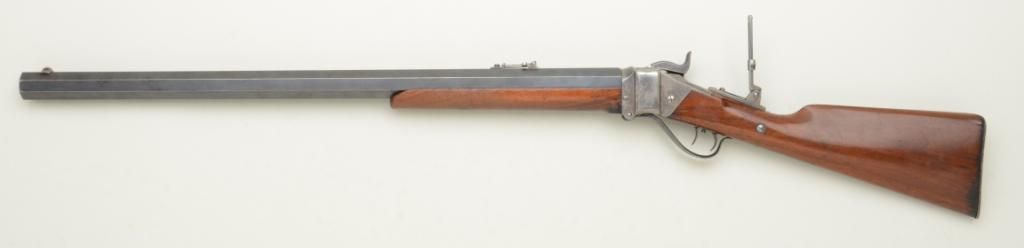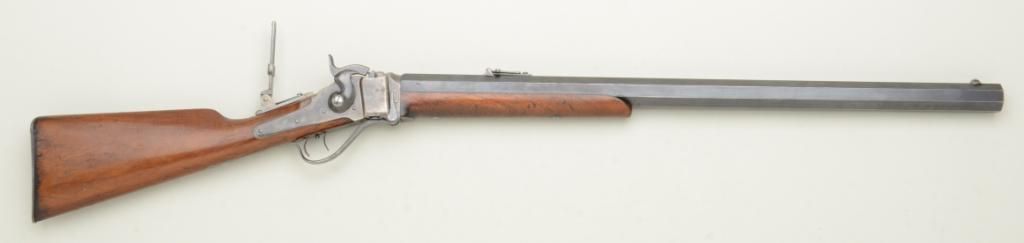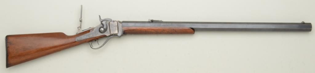 Original Sharps Model 1874 Sporting rifle, .40 cal., 2-5/8” 28” extra heavy barrel, blue and case hardened finish, wood stocks, checkered steel butt plate, #157594 on receiver and on the underside of the barrel(underside of barrel also has special feature numbers “6”, “16” & “10” stamped on the bottom flat with the matching serial number). This gun is in overall excellent condition showing approx. 97% original blue finish onthe barrel and approx. 75% original case colors on the receiver, double set triggers, “Old Reliable” marked Bridgeport barrel, Lawrence ladder rear sight, standard fixed front sight adjustable period flip up tangsight; the bore is excellent, the action, crisp, double set triggers are working at time of description, wood stocks are overall fine with some scattered minor mars from storage and a slight line of darkening of the wood around the steel butt plate; accompanied by a factory letter dated October 27, 1995 from Dr. Moore indicating rifle invoiced April 8, 1878 to Spies Kissam & Co., New York City as a Heavy Sporting Octagon