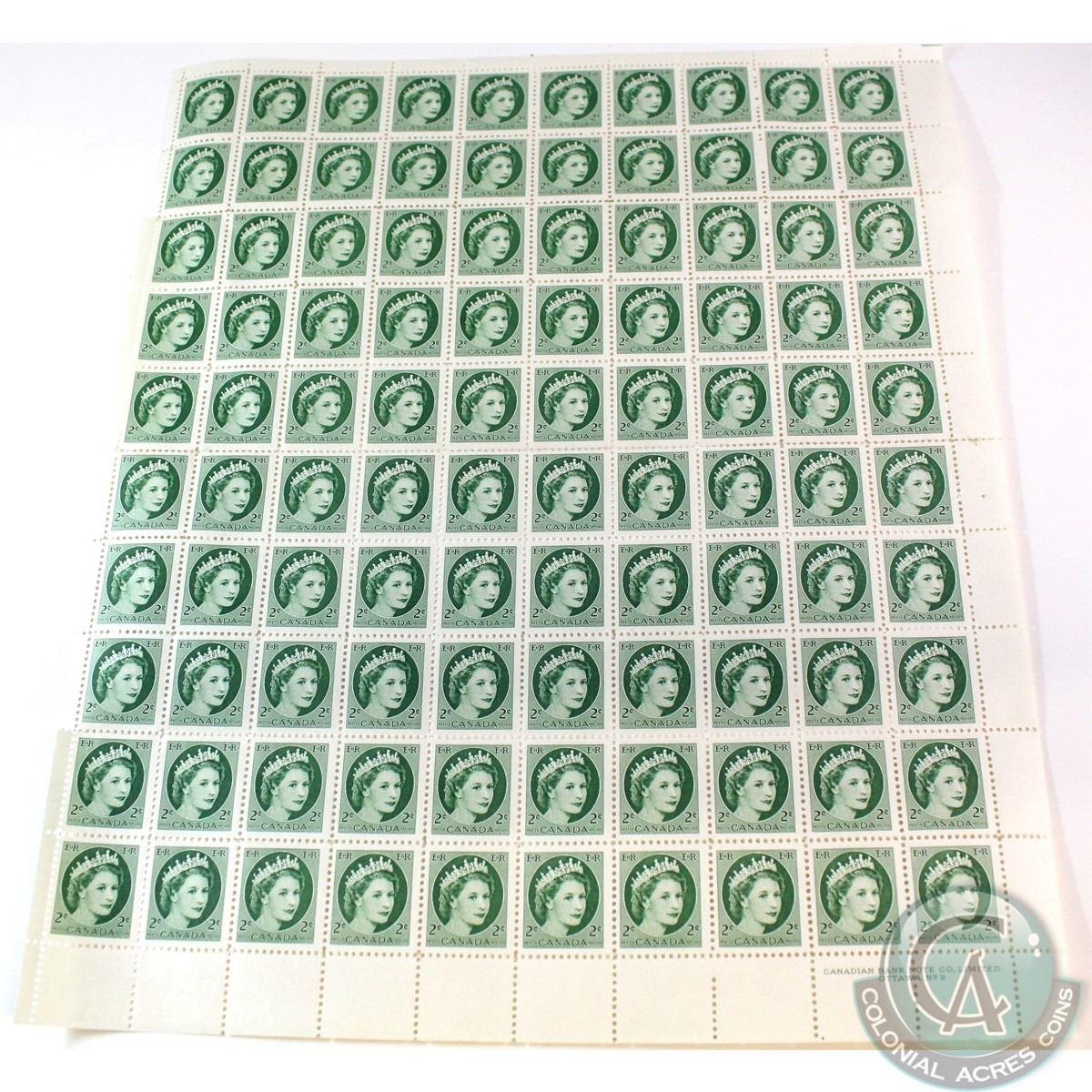 Original Sheet of 100x 1954 Elizabeth II 2-cent Stamps.