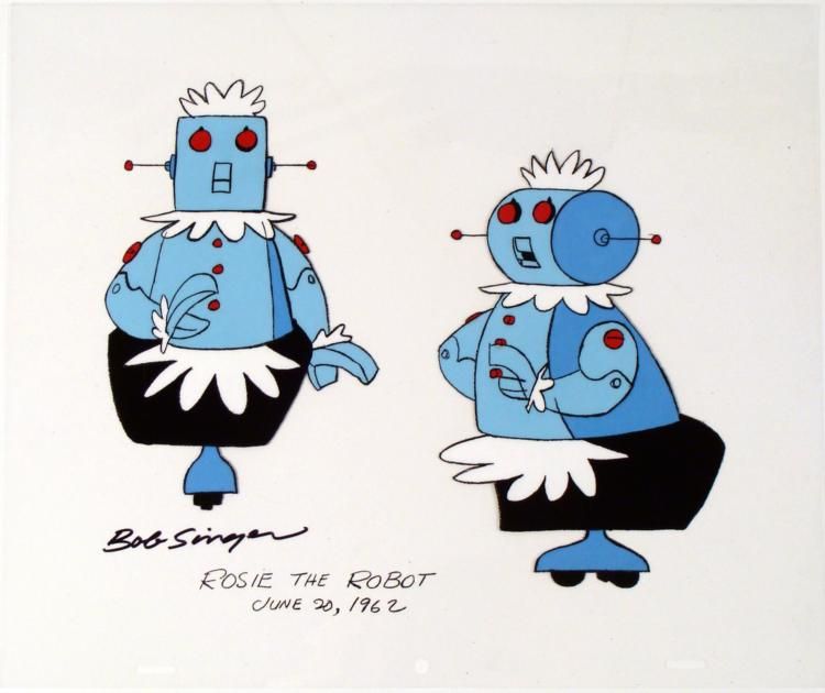 This is an original signed production cel from the hit tv show "The Jetsons". Bob Singer signed the cel at the bottom in black sharpie. * * * Bob Singer is an American animation artist, character designer, layout and background artist and storyboard director of animated television programs, most memorably of several Hanna Barbara productions such * as The Flintstones, Jonny Quest, Scooby-Doo, Yogi Bear, Droopy, Tom and Jerry, The Jetsons, The Smurfs, Superfriends, and the Harlem Globe Trotters cartoons. * * * George Jetson is married and lives with his family in the Skypad Apartments in Orbit City, where all homes and businesses are raised high above the ground on adjustable columns in the Googie style, reflective of Seattle's Space Needle * and the Theme Building of the Los Angeles International Airport. George is married to Jane, the homemaker, and the couple have two children: teenage daughter Judy; and preteen son Elroy. Housekeeping is seen to by a robot maid, Rosie, handling chores not otherwise * rendered trivial by the home's numerous push-button Space Age-envisioned conveniences. The family has a dog named Astro, who talks with an initial consonant mutation in which every word begins with an 'R', as if speaking with a growl.Jetson's workweek is typical * of his era: three hours a day, three days a week. His boss is Cosmo Spacely, the bombastic owner of the company Spacely Space Sprockets. Spacely has a competitor, H. G. Cogswell, owner of the rival company Cogswell Cogs (sometimes known as Cogswell's Cosmic * Cogs). Jetson commutes to work in an aerocar that resembles a flying saucer with a transparent bubble top. Daily life is leisurely, assisted by numerous labor-saving devices, which occasionally break down with humorous results. Despite this, everyone complains * of exhausting hard labor and difficulties of living with the remaining inconveniences. * * Here you see both of the good sides of Rosey the Robot... What you see is pretty much what you get; you can't really go wrong in this instance. * * * * * * Original Animation Cel * * Overall Size of the Cel: 10 1/2" x 12 1/2"" * * Condition: ExcellentDate: June 20, 1962 * * * This is an original hand-painted animation cel. Each one-of-a-kind cel represents a slight change in position of the characters. When individually photographed and projected in rapid succession, the images appear to move. * * To create production cels, the original animator's drawing is transferred onto an acetate cel (by hand-inking and/or photo copying). The cel is then hand-painted on the reverse side. * * * * * The cel is ready to be matted and framed. The animators notations are located at the bottom of cel. * * * *