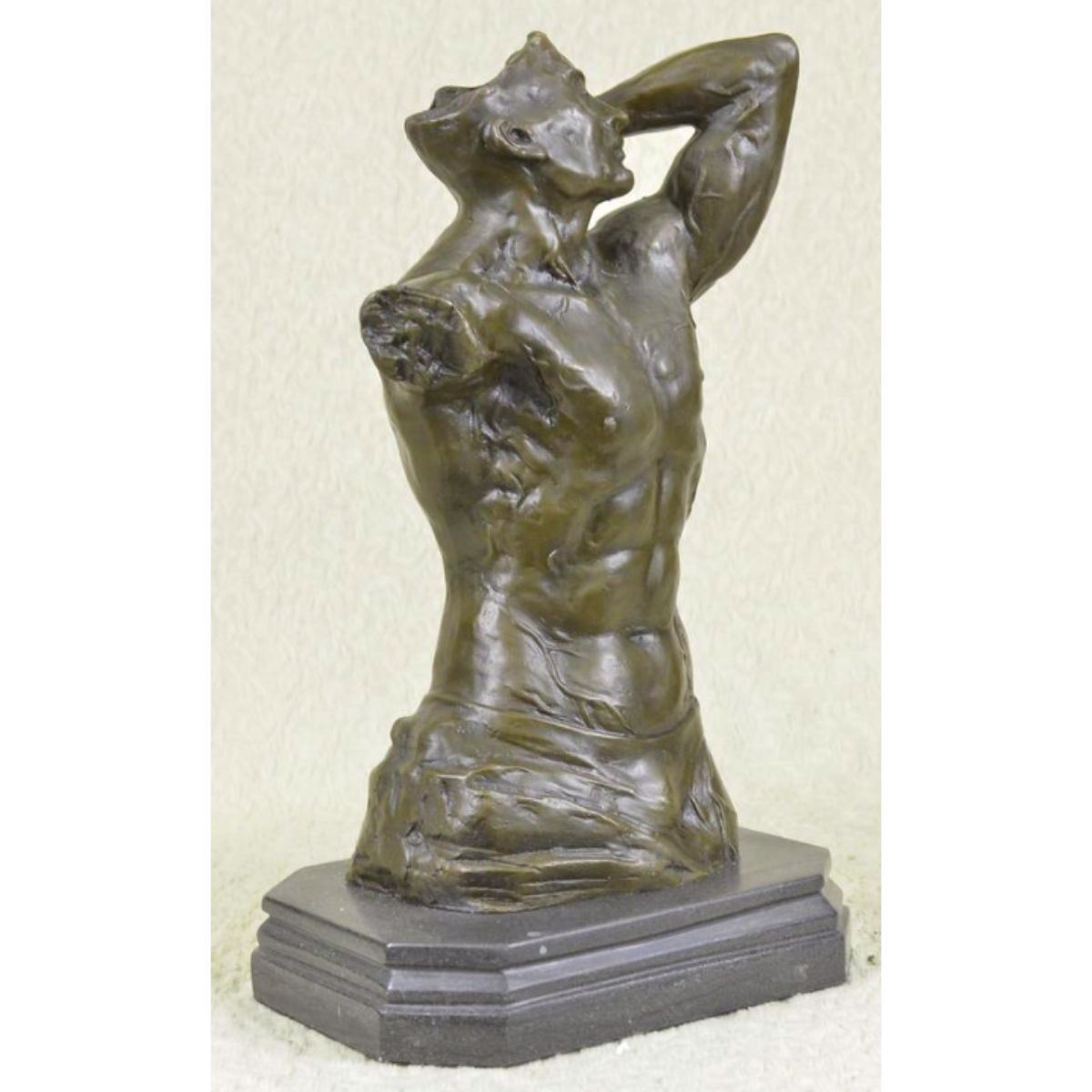 Original creation, male torso sculpture, signed by the artist, Nick. Lost wax casting method bronze, with brown patina, mounted on marble base. 14 1/2" H x 9" W. 12lbs.