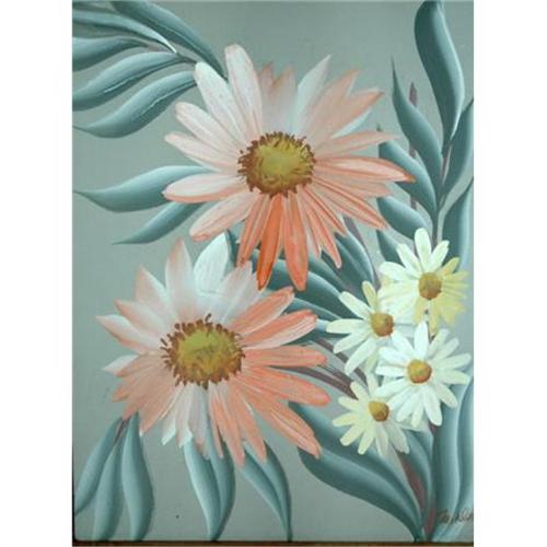 Lovely vintage original floral oil painting. There is lovely use of colors here. I love the splash of orange in the flowers on a background of the pale green and gray It is signed with what looks like "M.Davids" but I am only making a wild guess. <p> The painting is in a awesome gold painted wood with a rope design. The painting is 18" x 14". The frame is 15 1/2" x 19 1/2"<p> The condition is very good. There is a raised dot towards the bottom. I don't dare try to pick it off and pull off the paint. There are some very faint dots just above the pedals of the top flower on the gray background. They are placed in order in an arch that looks like the painter intended to paint longer pedals or more pedals but change their mind. There are dots on the some of pedals that are suppose be there. They look natural, as a real flower pedal would have. All of this is visible in the close up picture that is with the signature picture.
