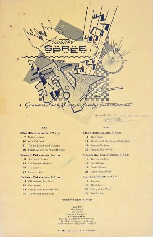 Laminated Austin SPREE Summer of 79 Concert Series Poster. Summer Parks Recipe for Evening Entertainment. Signed " To Ray the human! Guy Juke. 13 X 19.5 inches From Ray Benson's personal collection.
