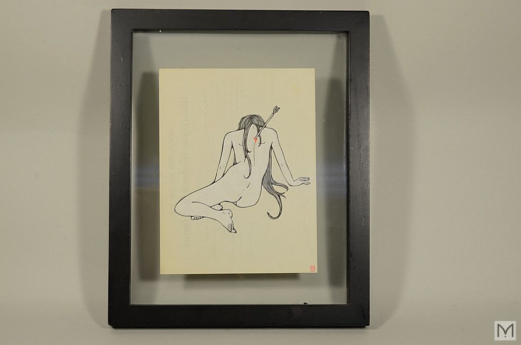 Original Signed Ink & Gouache Drawing of a Nude Pierced by an Arrow. Drawn on the back of a 'Identification and Time Slip' from the Tamarack-Custer Consolidated Mining Company (Wallace IDAHO, USA) Dated 3-17-17.