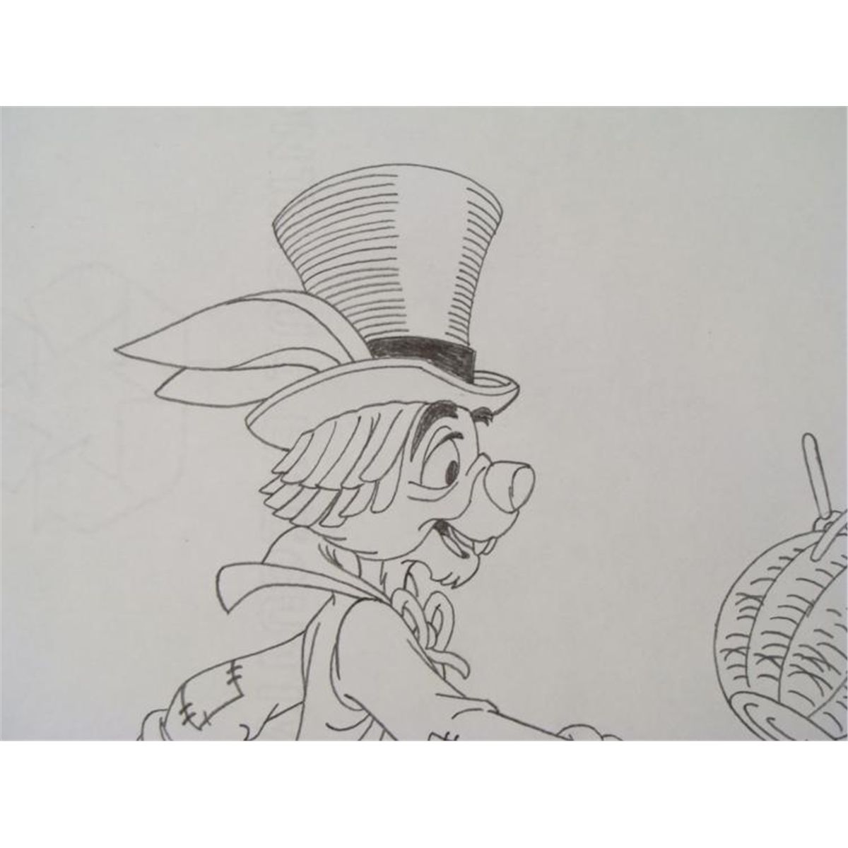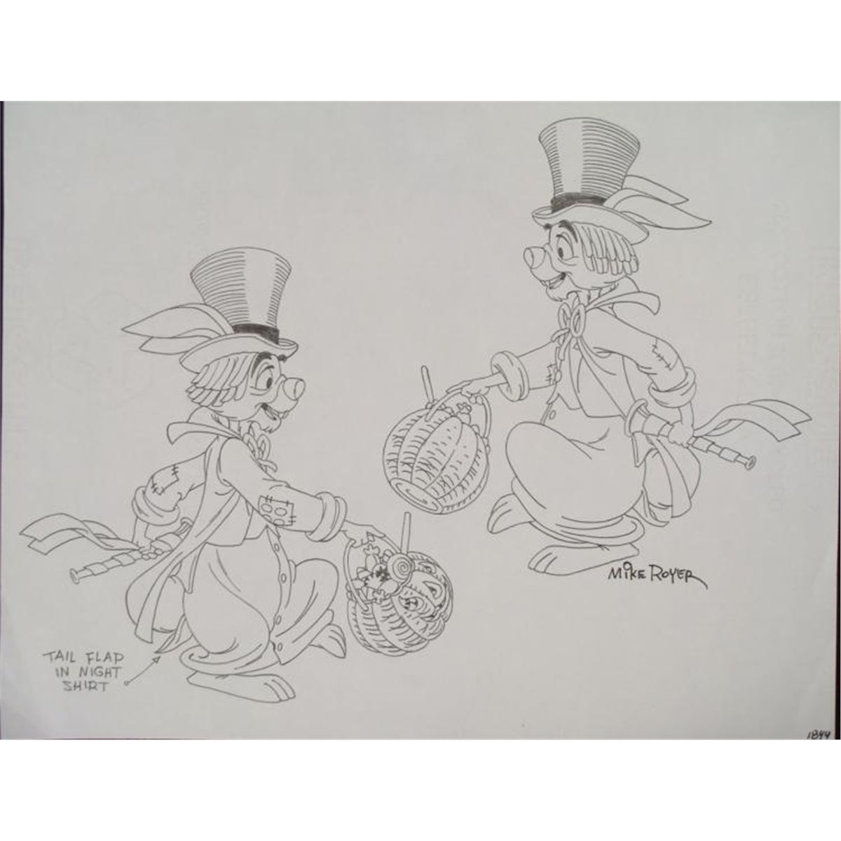 Shown here are two rabbits joyfully hopping around with a telescope in one hand and a bucket full of candy in the other. This original production drawing was used in a cartoon, and it is signed by the artist himself! * * Artist: Mike RoyerSignature: In black ink lower right * Medium: Black pencil on paperDetails: on lower right and left corner * Sheet size: 8 1/2 x 11 inchesCondition: Very good; slight crease to the lower left corner *