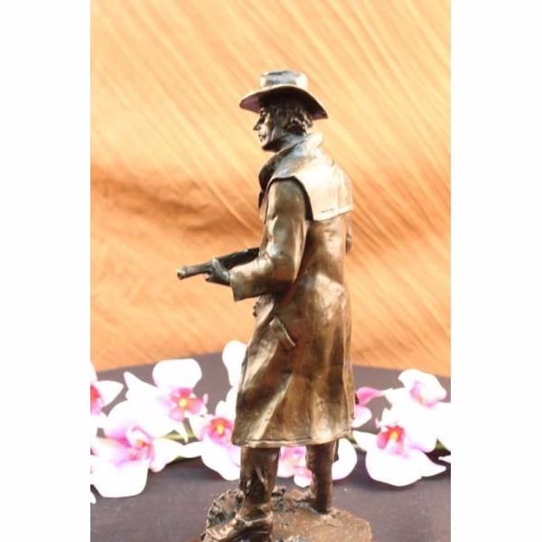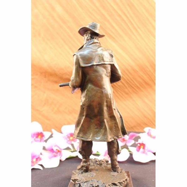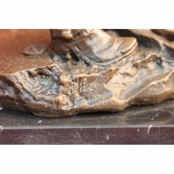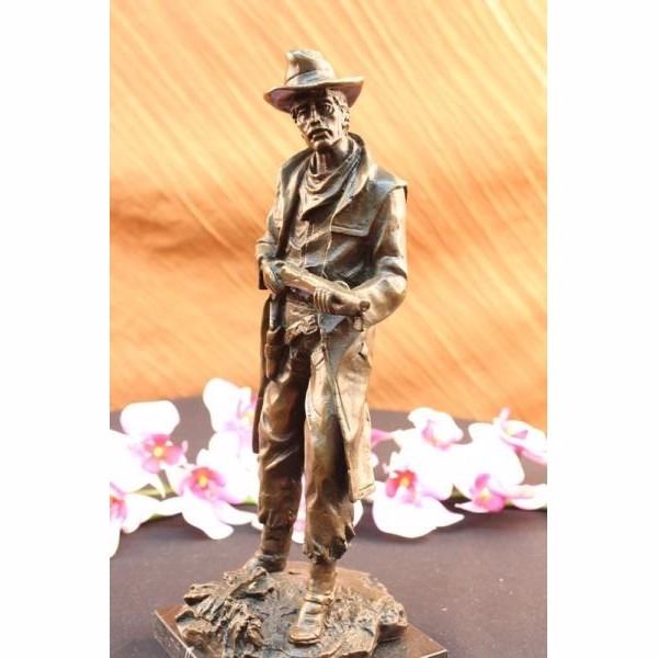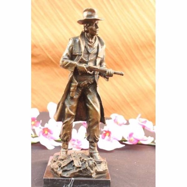 This is a sculpture of a classic cowboy. He wears his cowboy hat and his handkerchief loosely tied around his neck. His jacket is long and hangs to hiscalves and his gun hangs right below his waist line in his handy holster. On his feet he wears boots which his jeans cover in between his legs is a bunch of wood that he walks over. In his hands he holds his rifle and looks off into the distance as if he heard something, he is a cowboy and is always on the look out. This is a beautifully detailed sculpture and depicts the way of cowboy life as it should be. This sculpture was cast using the "Lost Wax Method" and has a brown patina. He is mounted on a marble base and is signed by artist Milo. Condition: This sculpture is in perfect condition. Bronze Dimensions with Marble Base:Height 12" x Width 5" Marble Dimensions: 4 1/2" X 4 1/2" . Height without base: 11" Weight : 7 LBS Inventory :63B3073836