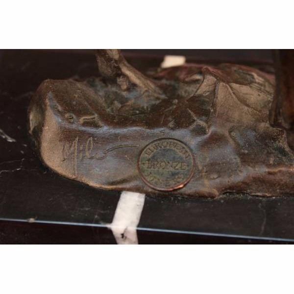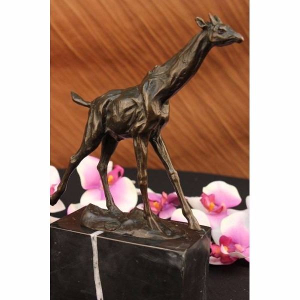 Of all the animals in the world, the giraffe is the tallest and has the longest neck. A male giraffes head may be as much as six meters above the ground. A female is only a little shorter. Nearly half of the giraffes great height is in its neck and head. Even so, the giraffe has only seven bones in its neck, the same as most other mammals and each of the bones are very long. A giraffe eats leaves and grass. In order to eat grass, it must spread its front feet wide apart so that I can get its head down the ground. Mostly it eats leaves. The giraffes long neck enables it to eat leaves that are beyond the reach of other ground animals. The giraffe twists its long tongue around the highest leaves and pulls them into its mouth then it chews them with its teeth and long, flexible upper lip. This amazing sculpture shows the giraffe in a walking stance his left leg slightly back and his front right leg moving forward. This well cast and highly detailed 100% bronze has captured this magnificent mammal in a lifelike pose and has a very attractive patina finish and is signed by artist Milo. Condition: This sculpture is in perfect condition. Bronze Dimensions with Marble Base:Height 10 1/2" x Width 10" Marble Dimensions: 5" X 3" Height without base: 7 1/2" Weight : 7 LBS Inventory : 32K3092123