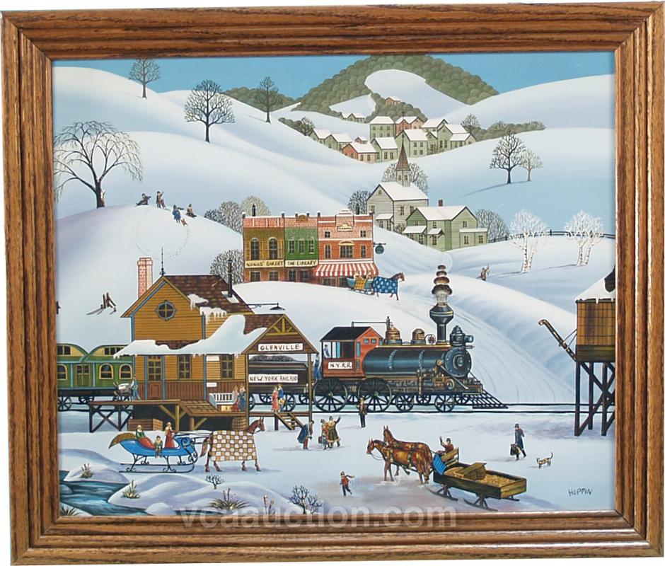Original Signed Oil Painting By Hoppin, depicting New York railroad "Glenville" station in winter, in wood frame - 26" x 22"