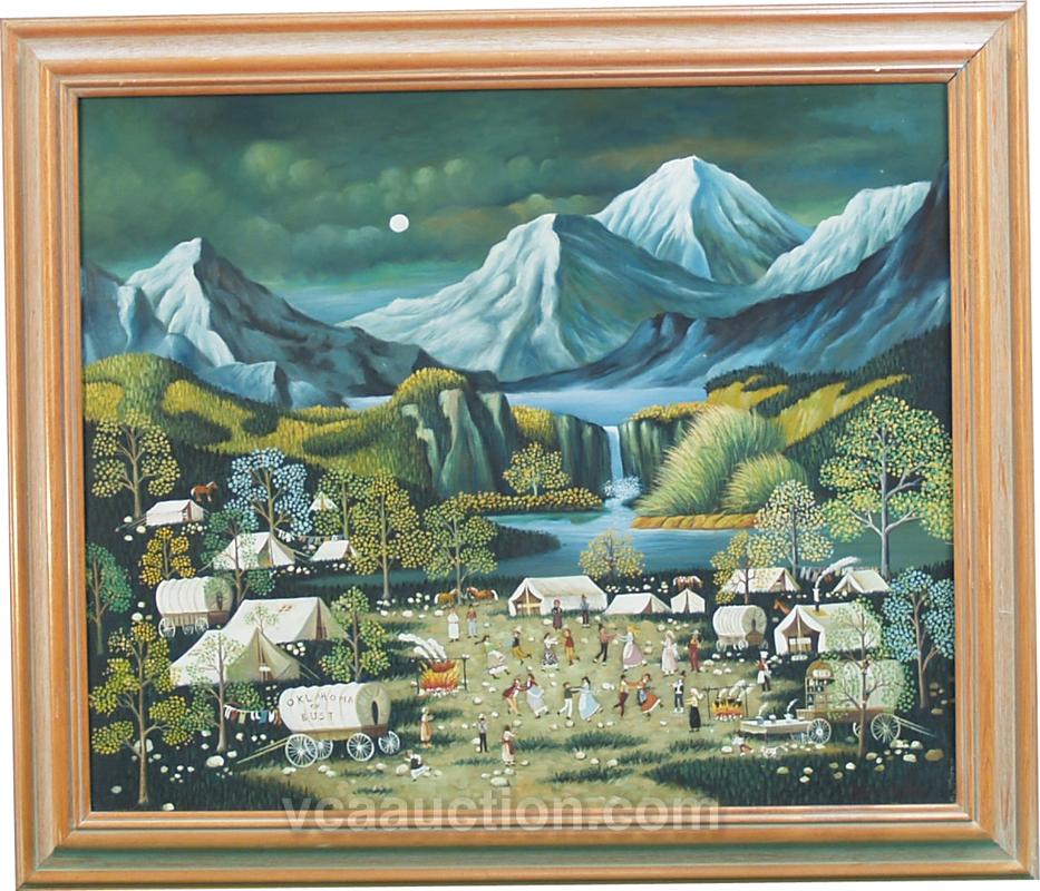 Original Signed Oil Painting By Julian Anders, depicting "Oklahoma Or Bust" covered wagon scene in wood frame - 25" x 20"