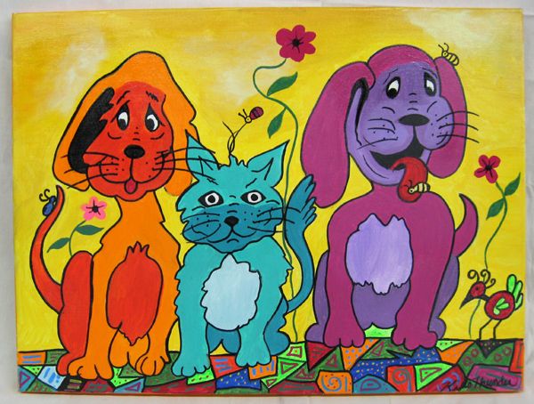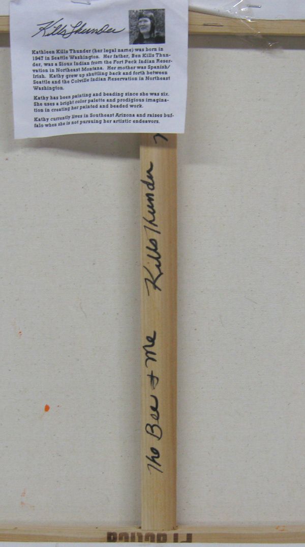 Original Signed Painting by Kills Thunder. This brightly colored piece is titled ''The Bee and Me'' and measures approx. 24''W x 18''H. Kathleen Kills Thunder was born in Seattle, Washington. Kathy has been painting and beading since she was six.  She uses bright color palette and prodigious imagination in creating her painted and beaded work. Kathy currently lives in Southeast Arizona and raises buffalo when she is not pursuing her artistic endeavors.
