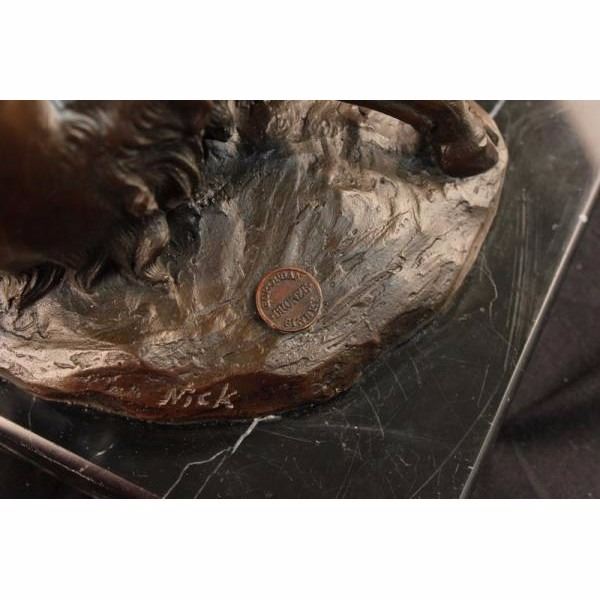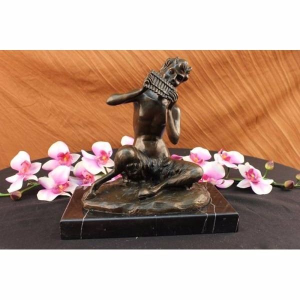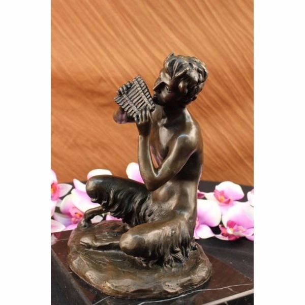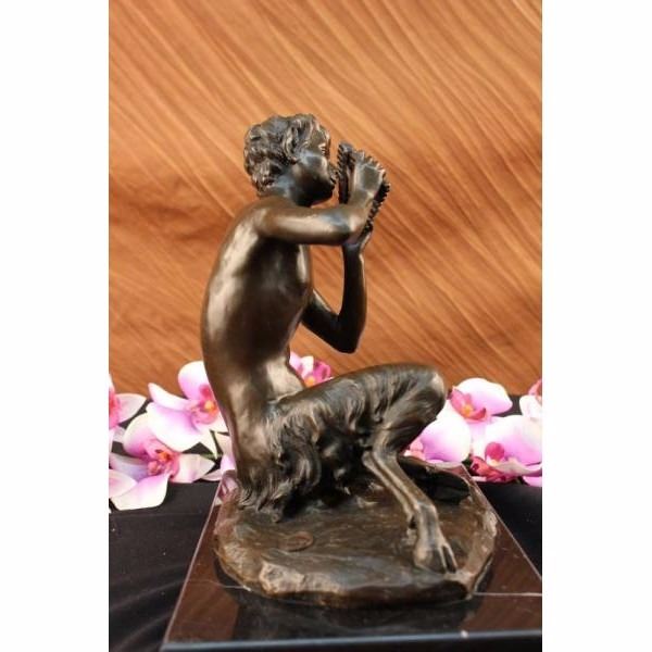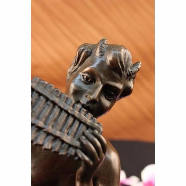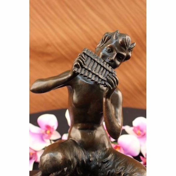 This sculpture of a satyr sitting down as he plays a set of flute pipes is astonishing. He is entertain and completely focus on playing all his notes right. He is normal from torso up, this half human half goat enjoys a nice summer day under a tree in the woods. Letting the music sounds fill his ears with symphony. This heavy sculpture is made from solid bronze and was casted using the "Lost Wax Method". It has a brown patina and is mounted atop of a rectangle black marble base and is signed by artist Nick. Condition: This sculpture is in a perfect condition. Bronze Dimensions with Marble Base:Height 11" x Width 9 1/2" Marble Dimensions: 6" x 9 1/2" Height without base: 10" Weight : 15LBS Inventory : 27RL0476372