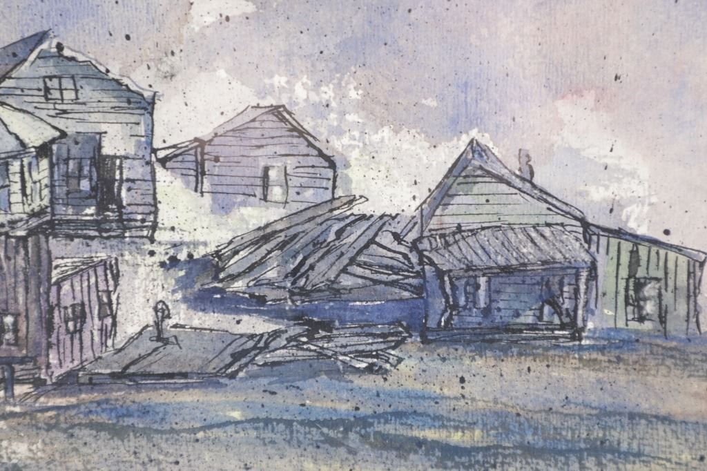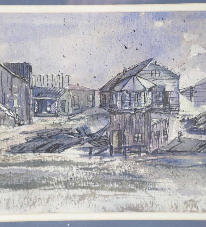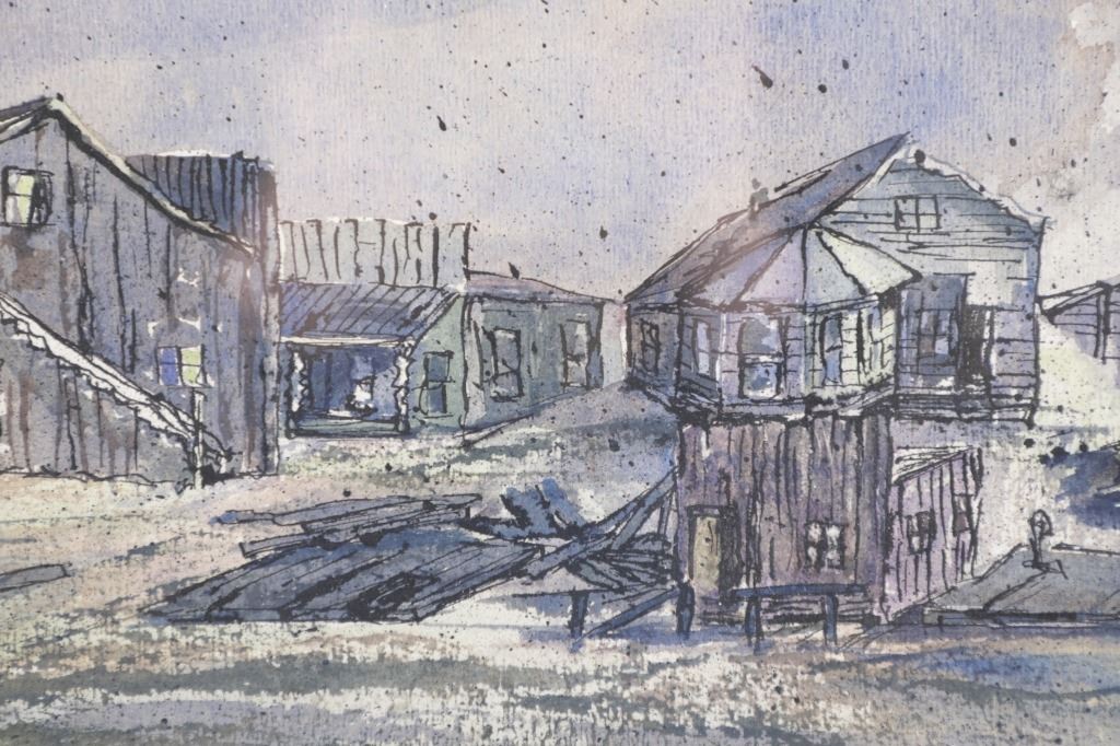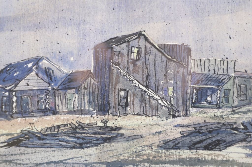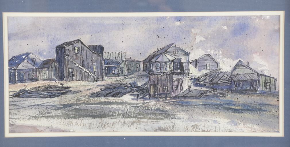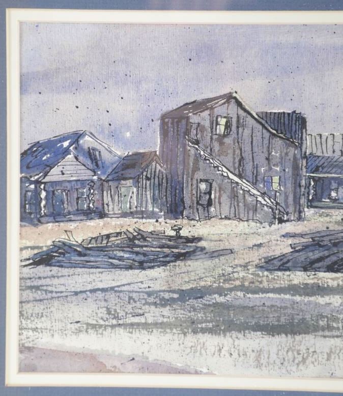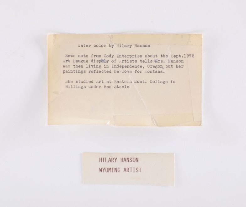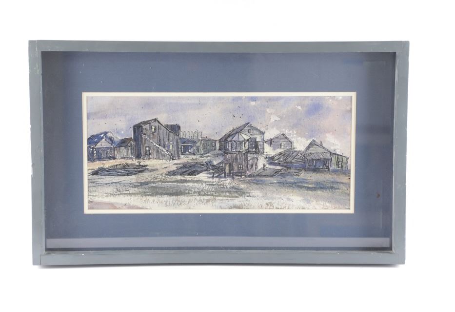 Included in this lot is an Original Signed Watercolour by former Western artist Hilary Hanson, circa 1972. Having lived and studied art at Eastern Montana College under the tutelage of Ben Steele, Hanson also lived in Independence, Oregon and Cody, Wyoming. Her paintings reflect her love for Montana which is known, among other things, for its "ghost towns". The 19th century mining boom town of Bannack Montana had its beginnings in the gold rush of 1862. It has been meticulously preserved, part of Bannack State Park. After gold was discovered there in 1862, the town quickly grew; 60 buildings, structures, mining artifacts, and cemetery. There are churches, a school house, stores, and a Masonic lodge. But there are also sites of the antics of the Hurdy Gurdy Girls, and the hasty justice of the Vigilantes. Reports abound of hauntings and ghost encounters. This beautiful watercolour is framed shadowbox-style, double matted. Scuffing observed to frame edges. Visible art measures 8.25"W x 19.25"L, frame 16.25"W x 27"L x 1.75"D, weight 6lb, 2oz.