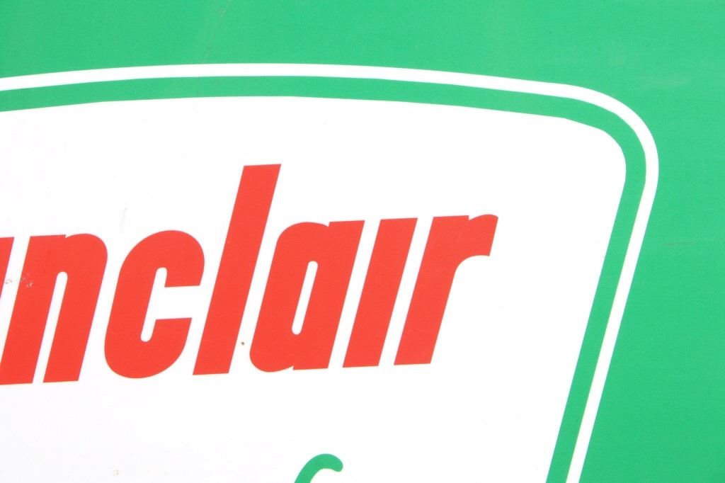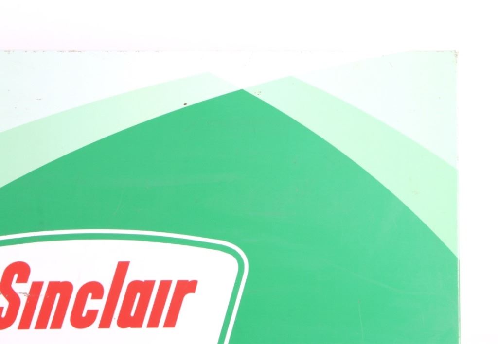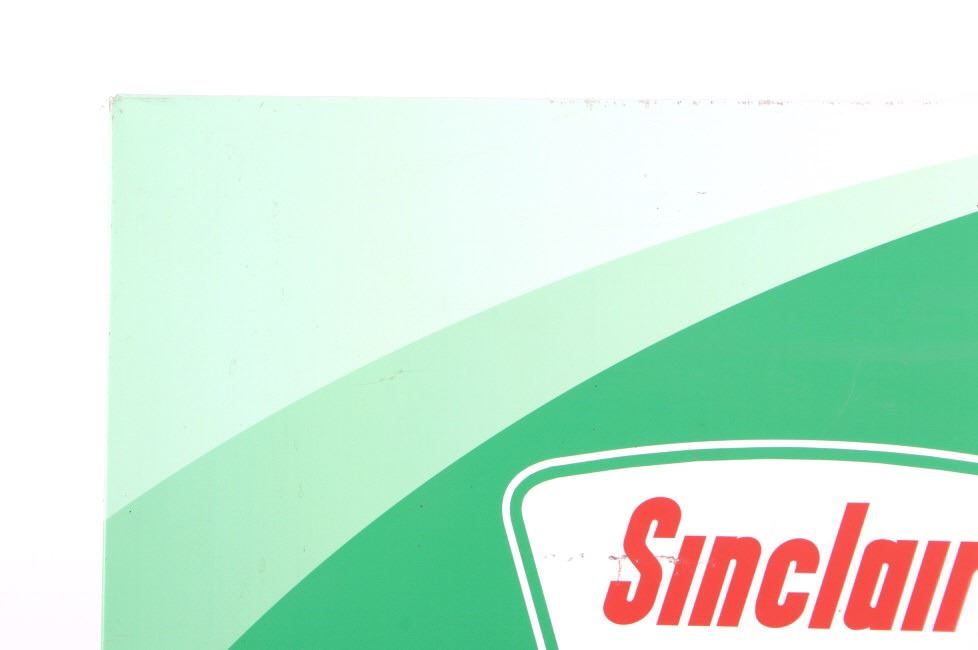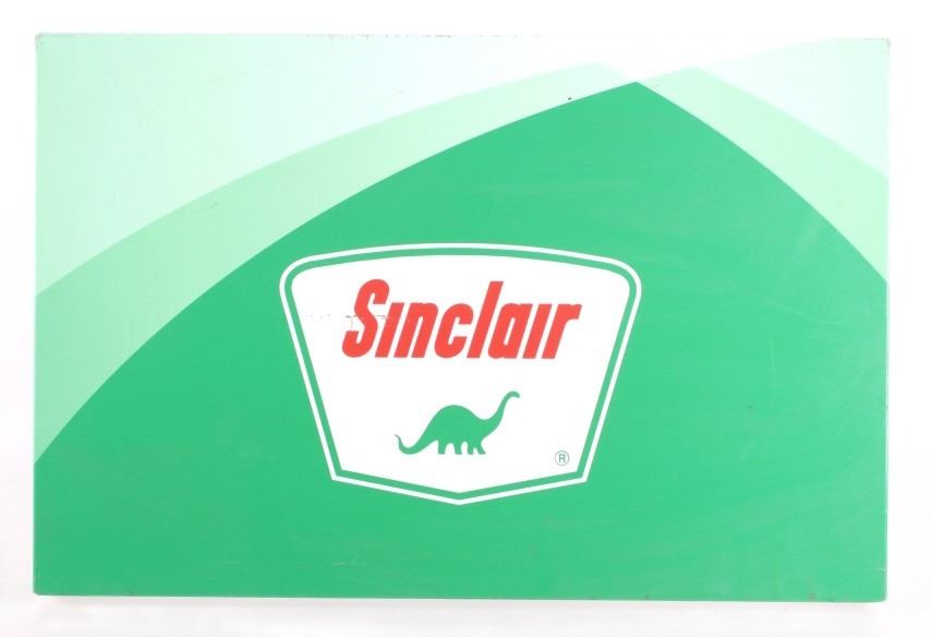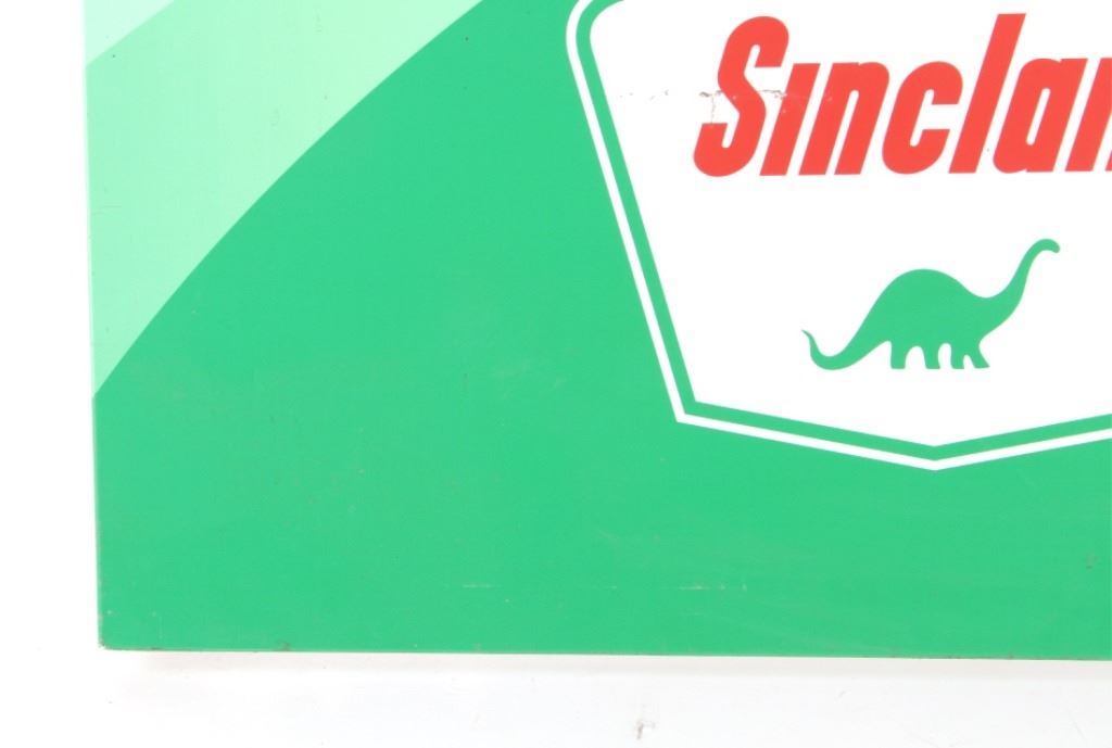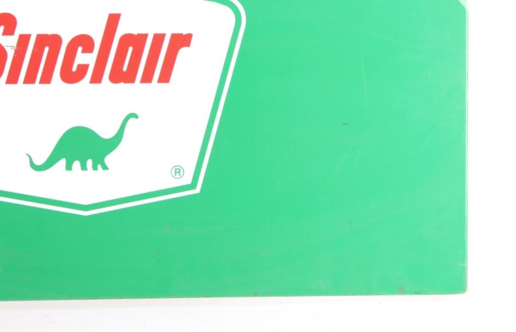 Featured in this lot is this original Sinclair boxed advertisement tin sign c. 1960's. The sign shows a classic design that features a green background and the Sinclair logo showing a white field and the Sinclair "Dino' underneath the the name. This is a box sign with some depth. The condition of this sign is good with no obvious signs of damage and shows good overall condition. The measurements of this sign is 20" x 30 1/4" x 3".