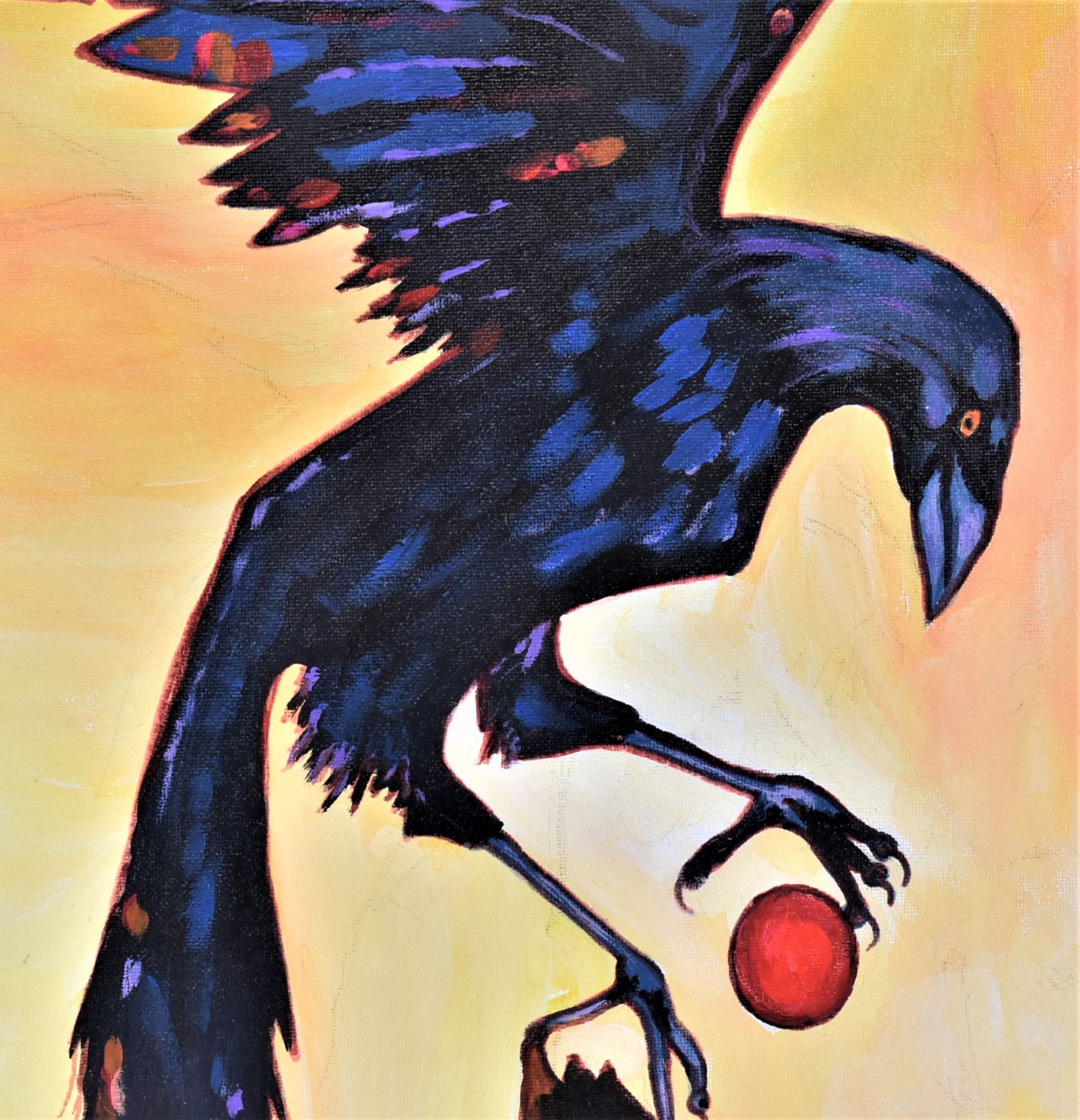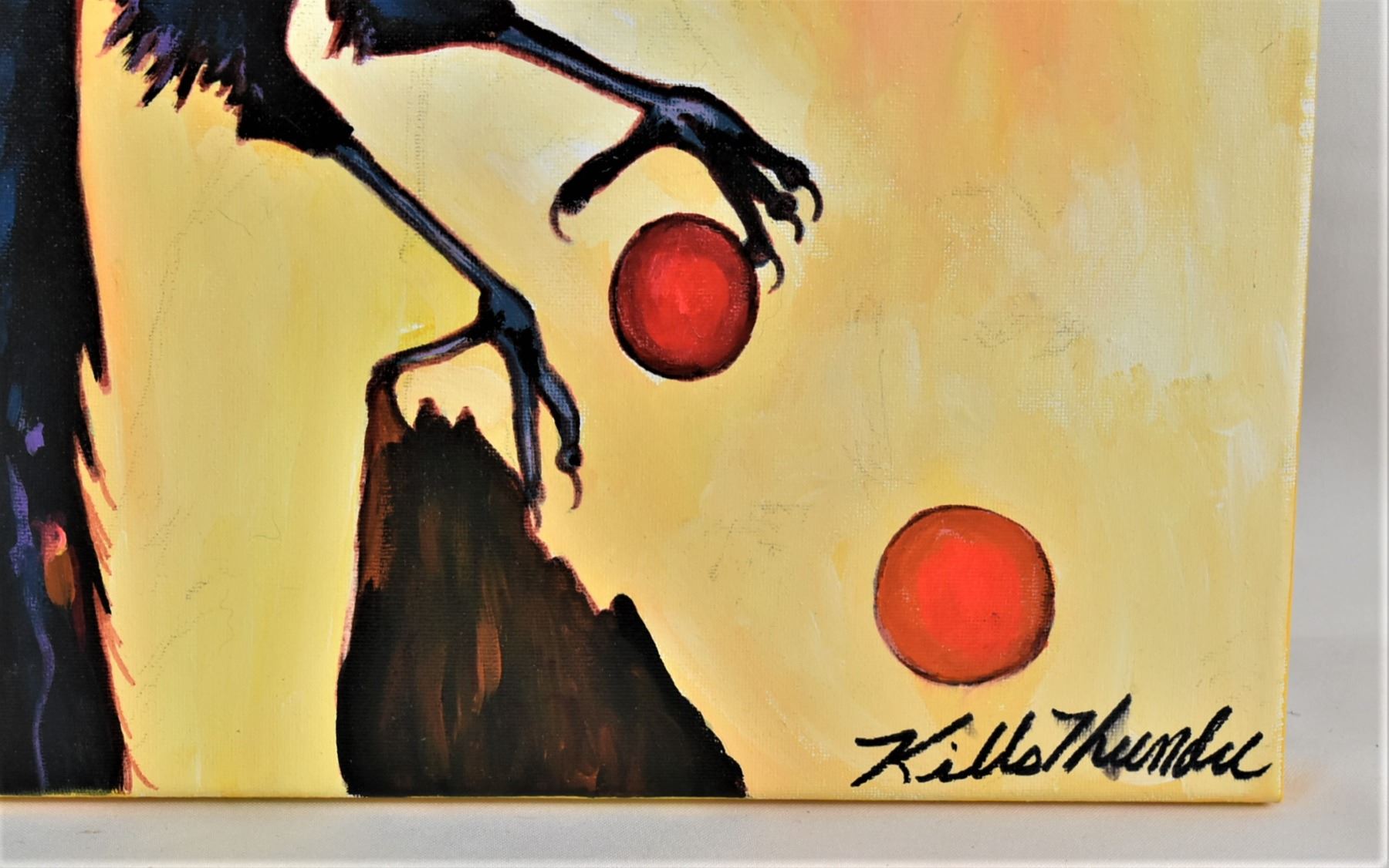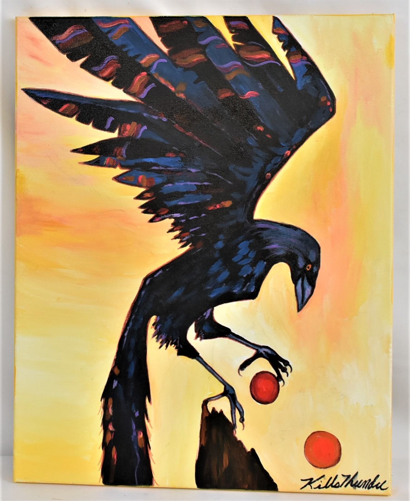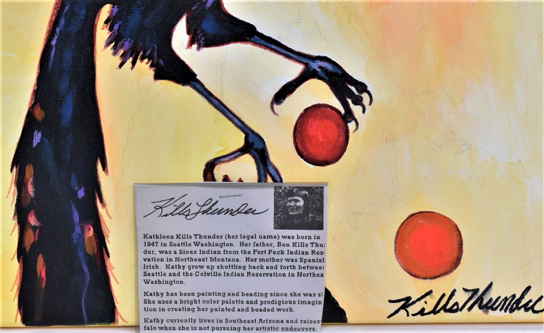 Original Native American Sioux Acrylic Painting ''Crow's Feet'' by Kathy Kills Thunder, measures 16'' x 20'' and is signed by the artist, beautiful vibrant colors, Artist Bio: Kathleen Kills Thunder (her legal name) was born in 1947 in Seattle, WA. Her father, Ben Kills Thunder, was a Sioux Indian from the Fort Peck Indian Reservation in NE Montana and her mother was Spanish/Irish. Kathy has been painting and beading since she was six.