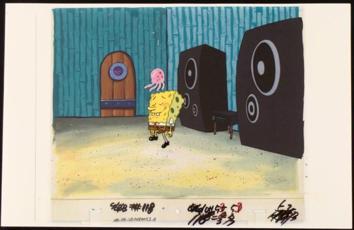To create production cels, the original animator's drawing is transferred onto an acetate cel (by hand-inking and/or photo copying). The cel is then hand-painted on the reverse side. The printed background is ready to be matted and framed. It is a colored background with a cel and has the animator's notations at the bottom of the background and the cel. The background is a printed reproduction background. There is some slight paint fade to SpongeBob's outline. The cel has multiple layers; first is the jellyfish and the second cel is SpongeBob.