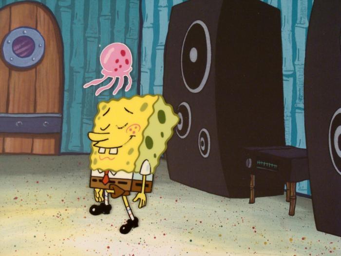 This animation cel and reproduction background are from the Nickelodeon TV show SpongeBob Squarepants. The story takes place under the deep blue sea in Bikini Bottom, where SpongeBob resides. SpongeBob, who is a yellow, porous sponge, is your typical happy-go-lucky character, as he is always cheerful and enjoys making people laugh. Patrick Star, SpongeBob's neighbor who is a starfish, is your average children's show idiot, as he boasts knowing nothing and is often getting himself into ridiculous situations. Between the homes of these two lies the home of the miserable Squidward, a squid, who is known for being grouchy and playing tricks on SpongeBob and Patrick. Both SpongeBob and Squidward work at the Krusty Krab, a fast food business run by the greedy money-loving Mr. Krabs, a crab, the arch rival of the evil, possibly misunderstood, Plankton. Another neighbor, Sandy Cheeks, an athletic squirrel who normally wears an astronaut's space suit, was introduced in "Tea at the Treedome." She spends most of her time inventing and experimenting. SpongeBob is skipping past the jellyfish.Original Printed Background and Animated Cel Overall Size of Background: 11" x 17" Overall Size of the Cel: 10 1/2" x 12 1/2" Very good condition This is an original hand-painted cel set-up used in the production of an episode of "SpongeBob SquarePants." Each one-of-a-kind set-up represents a slight change in position of the characters. When individually photographed and projected in rapid succession, the images appear to move.