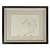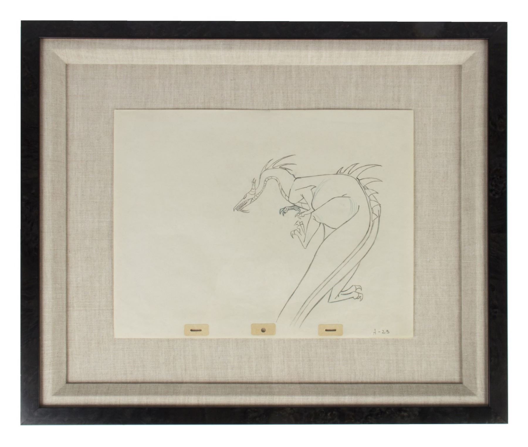 (Walt Disney Studios, 1959) A stunning original production drawing of Maleficent used during the production of Sleeping Beauty. The image is accomplished in blue and black pencil on 3-hole animation paper and has been custom-mounted and framed for a beautiful display. The animation paper measures 12.5"x15.5" in the 21.75" x 24.5" frame and is in very good condition with minimal edge-wear.