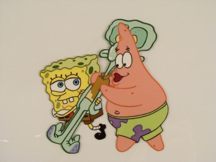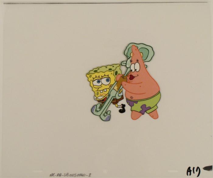 This original animation cel is from the Nickelodeon TV show SpongeBob Squarepants. The story takes place under the deep blue sea in Bikini Bottom, where SpongeBob resides. SpongeBob, who is a yellow, porous sponge, is your typical happy-go-lucky character, as he is always cheerful and enjoys making people laugh. Patrick Star, SpongeBob's neighbor who is a starfish, is your average children's show idiot, as he boasts knowing nothing and is often getting himself into ridiculous situations. Between the homes of these two lies the home of the miserable Squidward, a squid, who is known for being grouchy and playing tricks on SpongeBob and Patrick. Both SpongeBob and Squidward work at the Krusty Krab, a fast food business run by the greedy money-loving Mr. Krabs, a crab, the arch rival of the evil, possibly misunderstood, Plankton. Another neighbor, Sandy Cheeks, an athletic squirrel who normally wears an astronaut's space suit, was introduced in "Tea at the Treedome." She spends most of her time inventing and experimenting. What happened to Squidward?Original Production Animated Cel Overall Size of Cel: 10 1/2" x 12 1/2" Very Good ConditionThis is an original hand-painted cel set-up used in the production of an episode of "SpongeBob SquarePants." Each one-of-a-kind set-up represents a slight change in position of the characters. When individually photographed and projected in rapid succession, the images appear to move.