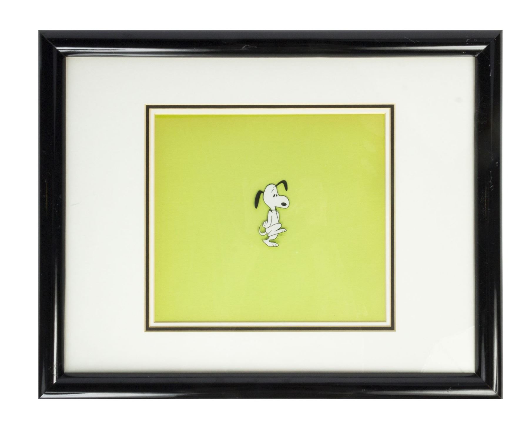 (Bill Melendez, c.1960s) An original hand-painted animation cel of Snoopy from an early Bill Melendez Studio animated "Peanuts" television special. The hand-inked image measures 3"x1.5" . The untrimmed cel measures 10.25” X12.5” within a 16"x20" frame. The cel has not been examined out of frame but appears to be in good condition with light wear. The frame has some edge-wear from previous display.
