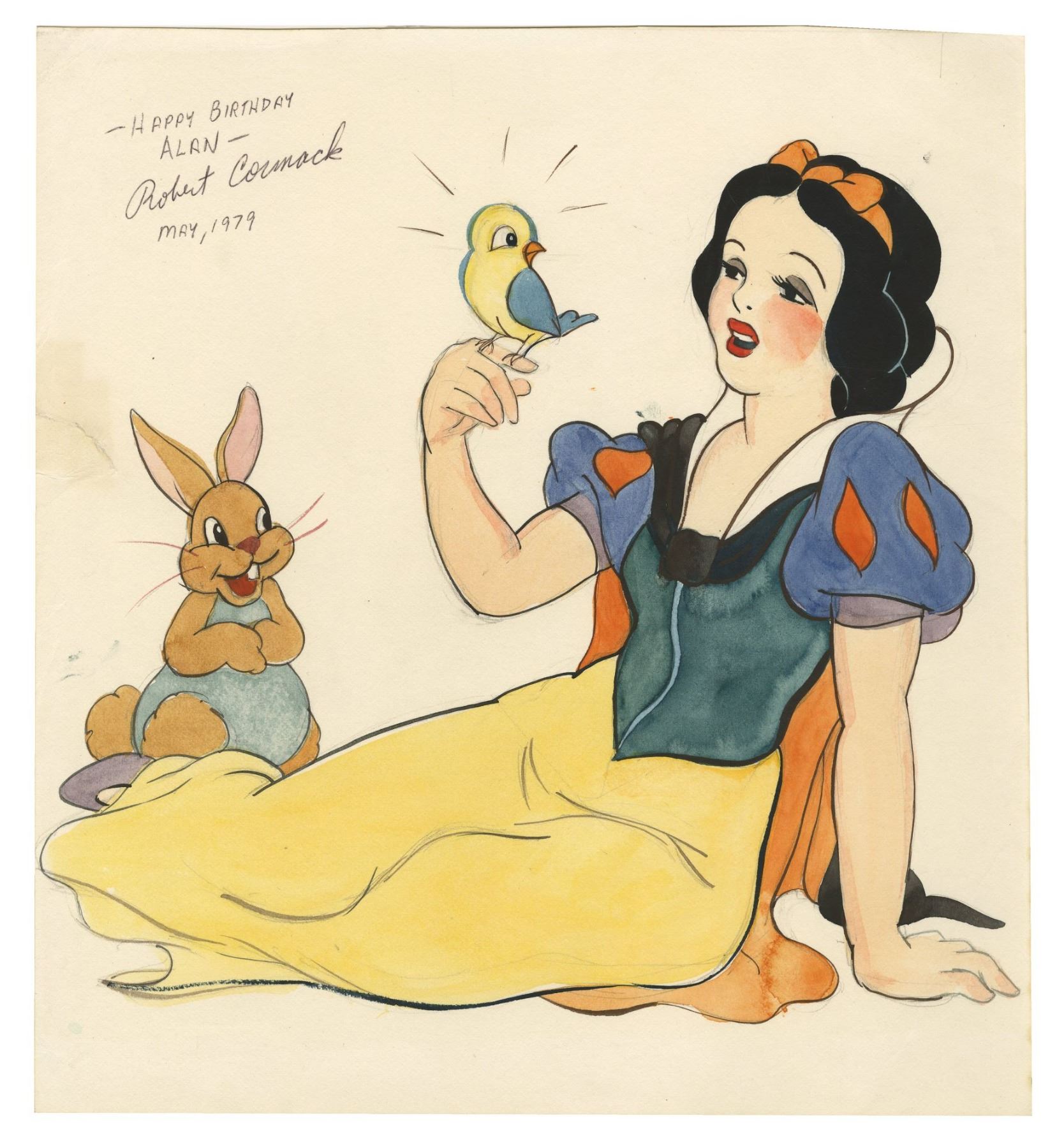 (Walt Disney Studios, 1979) An original drawing by Robert Cormack of Snow White. Cormack is known for his work as an art director on films such as Bambi, Dumbo, and Fantasia. Created in ink and watercolor on art paper, the drawing measures 12"x11" and is in very good condition. There is a small tear on the left which has been repaired with tape. Cormack personalized the image with "Happy Birthday Alan" above his signature on the upper-left corner.