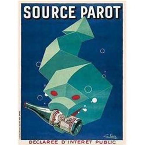 G. Favre created this French art deco poster for the bottled water company Source Parot in the late 1920s. Taking the firm's symbol of an ancient sea monster he transformed it into a green geometric one on a blue background holding the company's bottle in its mouth.