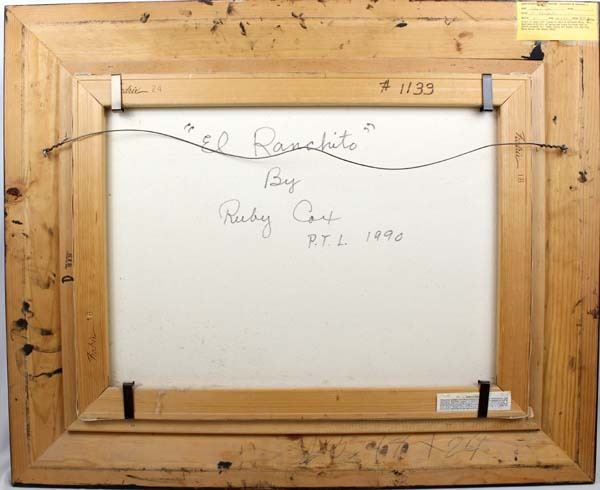 1990 Original Southwestern Oil Painting ''El Ranchito'' by Ruby Jo Cox (1934-2015) from Carlsbad, NM, visual measurement of 23.5'' x 18'', overall framed measurement of 27'' x 32'' and is signed by the artist, gold gilt wood frame, depicts stucco home, horno oven, and chickens