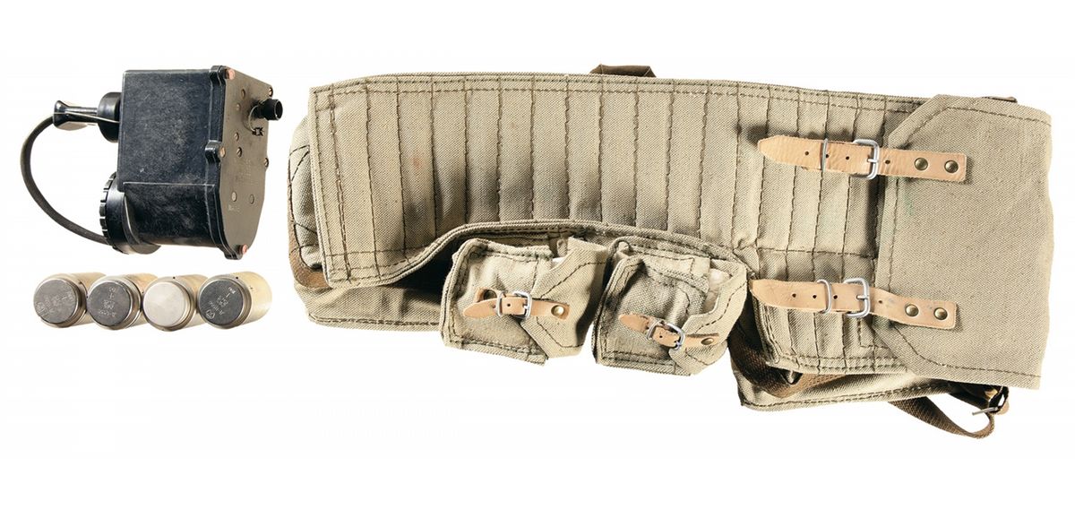 Measuring 19 1/2 inches overall. This is a super rare night vision sniper scope for the Russian SVD sniper rifle. Has an adjustable, detachable light filter on the front with a rubber eyecup in the rear. Cyrillic markings are present on the control unit, including a Russian "hammer and sickle" symbol. Included with the scope is a metal transport case, a canvas belt pouch, 6 interchangeable adjustment dials, an original spare rubber eyepiece, 4 batteries, a 9v battery adapter, canvas carrying case, a recharger and manual. (Very fine overall, with some mild handling marks on the scope body. The scope and accessories are not tested.)
