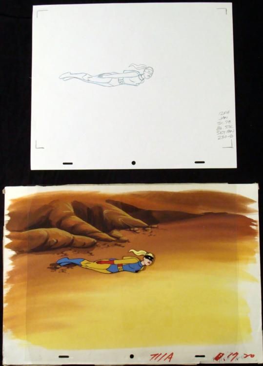 Jace is Space Ghost's young ward. He wears a * costume of light blue and yellow with a black facemask. Jace looks to be * about 15-17 years old. Jace has a jetpack to fly, a belt that gives * him inviso power, and an emblem of Space Ghost on his chest that is used * for a communications device. * * By the way... where the heck am I?? * Original Animation * Cel, Drawing and BackgroundOriginal "rough" animation drawing in black and non-photo blue pencil with the notations in black * Size of * cel: 10 1/2" x 12 * 1/2"Size of background: 10" x * 17 1/4"Size of drawing: 10 1/2" x 12 1/2" * Overall Condition: Background- Very good; minor rip to the background and Cel/Drawing- Excellent * This is * an original hand-painted cel. Each cel represents a * slight change in position of the * characters. When individually photographed and projected * in rapid succession, the images appear to move. To create * production cels, the original animator's * drawing is transferred onto an acetate cel (by hand-inking and/or photo * copying). The cel is then hand-painted on the reverse side. * The background accompanying this set-up is a hand-painted original * production background. * * * The background, drawing and cel are ready to be matted and * framed. The animators notations are located at the bottom of all three of them. * *