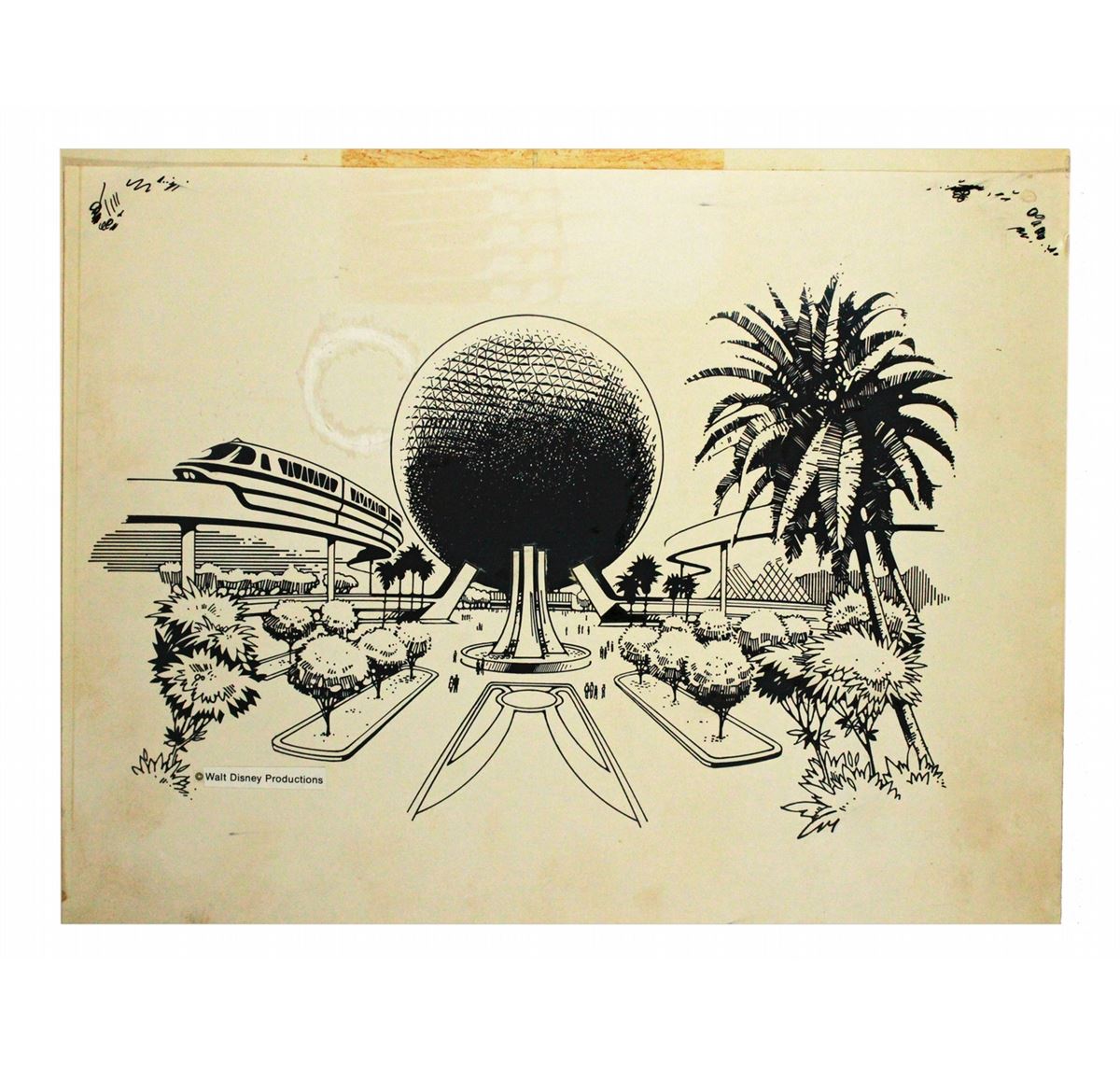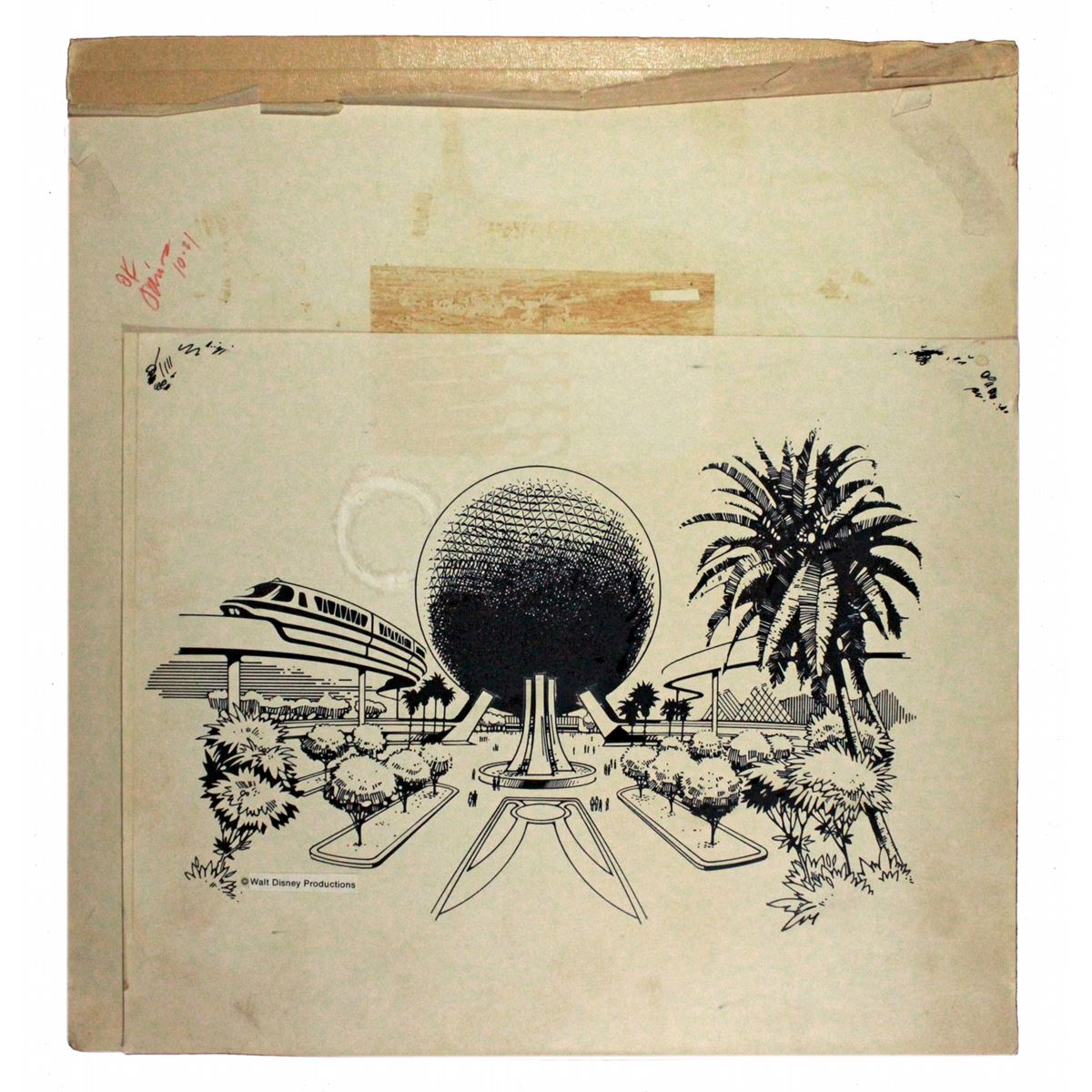 (Epcot, 1981) Beautiful Ink and pen on Photostat rendering of pre-opening merchandise artwork for EPCOT center. The artwork was used for many different types of merchandise, one of those being the mug included in this lot.