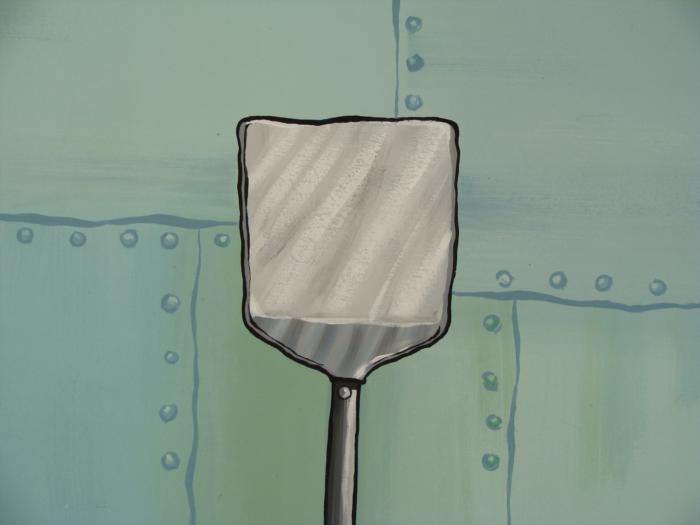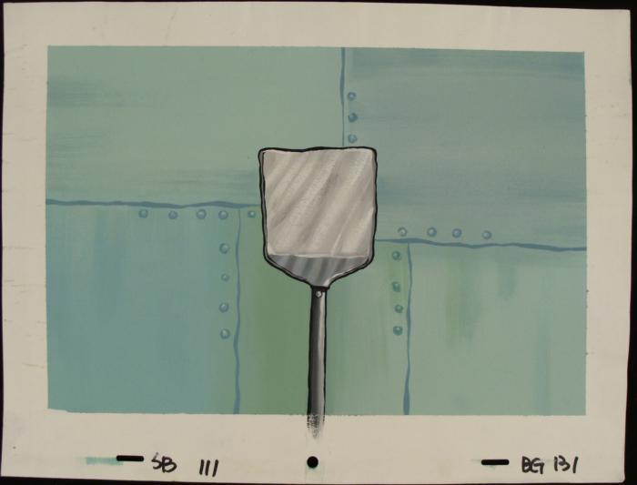 This original hand-painted background from the Nickelodeon TV show SpongeBob Squarepants. The story takes place under the deep blue sea in Bikini Bottom, where SpongeBob resides. SpongeBob, who is a yellow, porous sponge, is your typical happy-go-lucky character, as he is always cheerful and enjoys making people laugh. Patrick Star, SpongeBob's neighbor who is a starfish, is your average children's show idiot, as he boasts knowing nothing and is often getting himself into ridiculous situations. Between the homes of these two lies the home of the miserable Squidward, a squid, who is known for being grouchy and playing tricks on SpongeBob and Patrick. Both SpongeBob and Squidward work at the Krusty Krab, a fast food business run by the greedy money-loving Mr. Krabs, a crab, the arch rival of the evil, possibly misunderstood, Plankton. Another neighbor, Sandy Cheeks, an athletic squirrel who normally wears an astronaut's space suit, was introduced in "Tea at the Treedome." She spends most of her time inventing and experimenting. It's SpongeBob's spatulaOriginal Production Background Overall Size of Background: 10 1/2" x 13 3/4" Very good conditionOriginal Production Backgrounds are used in the making of the final version of animated productions. The background establishes the location and the overall good mood of the scenee. Typically, a background layout artist creates a drawing to establish the content of the scene, placement of characters, perspective and camera angle. Based on this drawing, the background artist creates a preliminary painting to confirm all of the scenes details, then the final production background which is used in the filming of the scene. When these backgrounds are individually photographed behind the progression of production cels, and projected at a rapid succession, the images in the foreground appear to move, creating an animated scene. The background is ready to be matted and framed. It is a colored background with the animator's notations at the bottom.