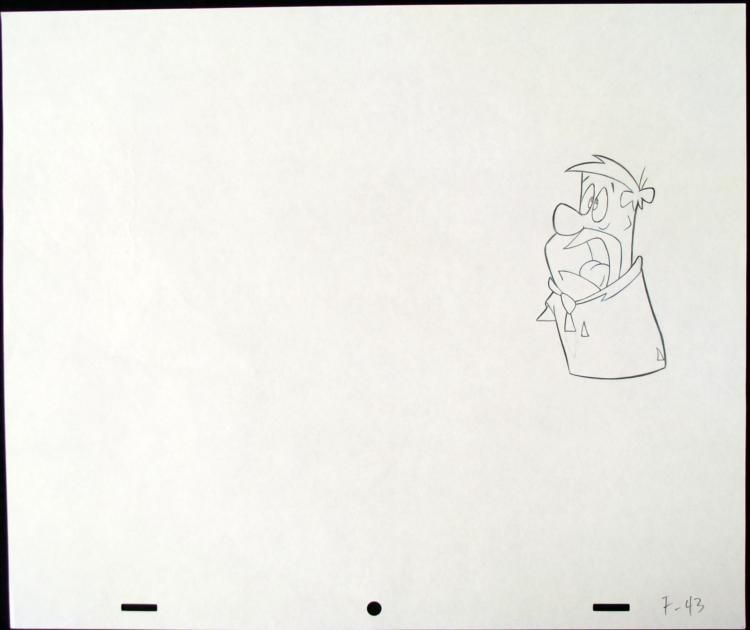 The show is set in the Stone Age town of Bedrock. (In some of the earlier episodes, it was also referred to as "Rockville"). The Flintstones was about a working-class Stone Age man's life with his family and his next-door neighbor and best friend. The show's * continuing popularity rested heavily on its juxtaposition of modern everyday concerns in the Stone Age setting. In this fantasy version of the past, dinosaurs, saber-toothed tigers, woolly mammoths, and other long-extinct animals co-exist with cavemen. Like * their mid-20th century peers, these cavemen listen to records, live in split-level homes, and eat out at restaurants, yet their technology is made entirely from pre-industrial materials and largely powered through the use of various animals. For example, the * cars are made out of stone, wood, and animal skins, and powered by the passengers' feet. * * * Wha-wha-wha-WHHHHAAT!?!?!?! * * * * * Original "rough" animation drawing, in non-photo blue and black pencil with the notations in black * Overall size is a 12-field drawing that is 10 1/2" × 12 1/2" * Excellent condition * Traditional animation is a multi-step process which includes various types of art techniques. Drawings are a key part of the process, in which the animator creates the design and movement of the characters. Drawings are then transferred onto acetate cels * (by hand-inking and/or photo copying) to create a production cel, which is then hand painted on the back side, using paint colors chosen and approved by the creator of the series. * * * The cel received by the winning bidder might be ever so slightly different from that in the auction photo. * * * * * The drawing is ready to be matted and framed. The animator's notations are shown at the bottom of the drawing. * *