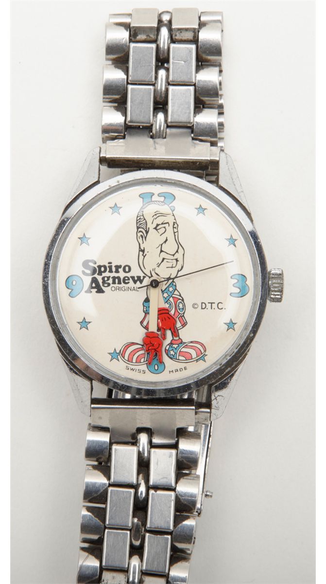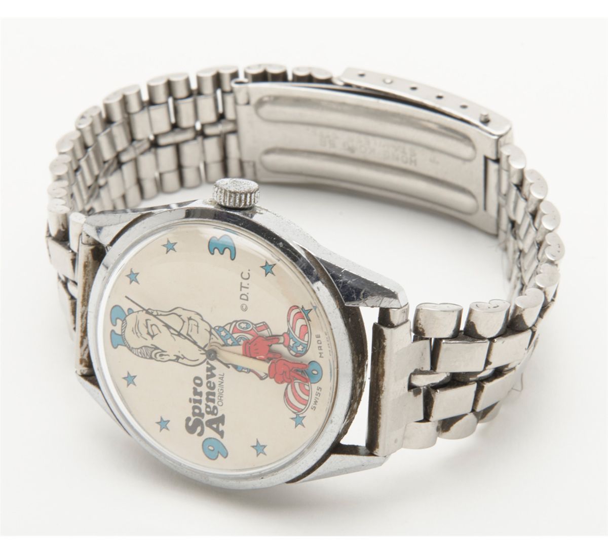 Original Spiro Agnew collectors watch with Swiss movement in near excellent condition. Absolutely authentic and not a repo. One of the only watches of this type with a quality Swiss movement. Est.: $125-$250