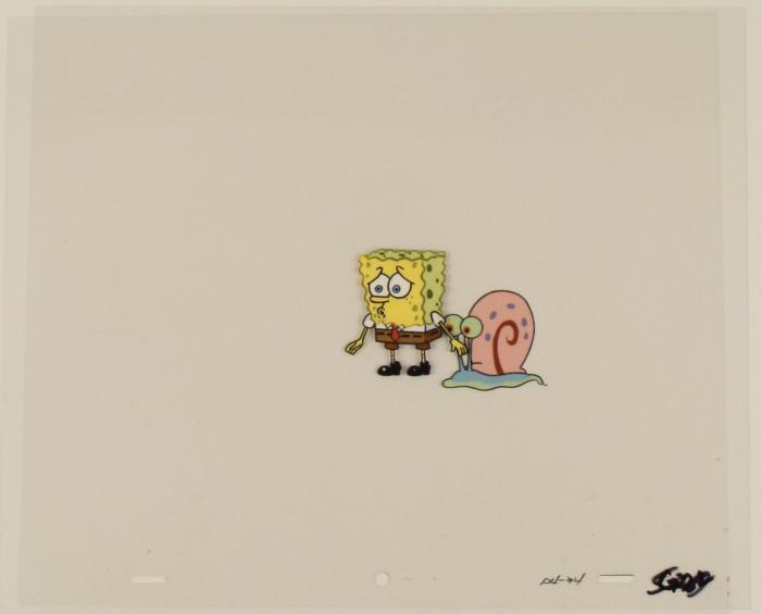 This original animation cel is from the Nickelodeon TV show SpongeBob Squarepants. The story takes place under the deep blue sea in Bikini Bottom, where SpongeBob resides. SpongeBob, who is a yellow, porous sponge, is your typical happy-go-lucky character, as he is always cheerful and enjoys making people laugh. Patrick Star, SpongeBob's neighbor who is a starfish, is your average children's show idiot, as he boasts knowing nothing and is often getting himself into ridiculous situations. Between the homes of these two lies the home of the miserable Squidward, a squid, who is known for being grouchy and playing tricks on SpongeBob and Patrick. Both SpongeBob and Squidward work at the Krusty Krab, a fast food business run by the greedy money-loving Mr. Krabs, a crab, the arch rival of the evil, possibly misunderstood, Plankton. Another neighbor, Sandy Cheeks, an athletic squirrel who normally wears an astronaut's space suit, was introduced in "Tea at the Treedome." She spends most of her time inventing and experimenting. SpongeBob is with his pet snail Gary.Original Production Animated Cel Overall Size of Cel: 10 1/2" x 12 1/2" Very Good ConditionThis is an original hand-painted cel set-up used in the production of an episode of "SpongeBob SquarePants." Each one-of-a-kind set-up represents a slight change in position of the characters. When individually photographed and projected in rapid succession, the images appear to move.
