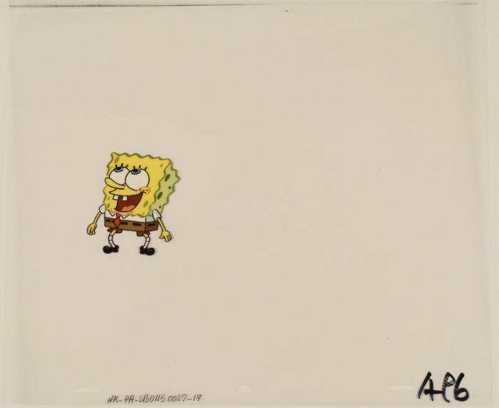 To create production cels, the original animator's drawing is transferred onto an acetate cel (by hand-inking and/or photo copying). The cel is then hand-painted on the reverse side. The cel is ready to be matted and framed. The animator's notations are at the bottom of the cel. There is some slight paint fade to SpongeBob's outline.