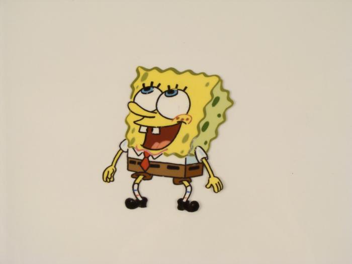 This original animation cel is from the Nickelodeon TV show SpongeBob Squarepants. The story takes place under the deep blue sea in Bikini Bottom, where SpongeBob resides. SpongeBob, who is a yellow, porous sponge, is your typical happy-go-lucky character, as he is always cheerful and enjoys making people laugh. Patrick Star, SpongeBob's neighbor who is a starfish, is your average children's show idiot, as he boasts knowing nothing and is often getting himself into ridiculous situations. Between the homes of these two lies the home of the miserable Squidward, a squid, who is known for being grouchy and playing tricks on SpongeBob and Patrick. Both SpongeBob and Squidward work at the Krusty Krab, a fast food business run by the greedy money-loving Mr. Krabs, a crab, the arch rival of the evil, possibly misunderstood, Plankton. Another neighbor, Sandy Cheeks, an athletic squirrel who normally wears an astronaut's space suit, was introduced in "Tea at the Treedome." She spends most of her time inventing and experimenting. SpongeBob is about to jump up.Original Production Animated Cel Overall Size of Cel: 10 1/2" x 12 1/2" Very Good ConditionThis is an original hand-painted cel set-up used in the production of an episode of "SpongeBob SquarePants." Each one-of-a-kind set-up represents a slight change in position of the characters. When individually photographed and projected in rapid succession, the images appear to move.