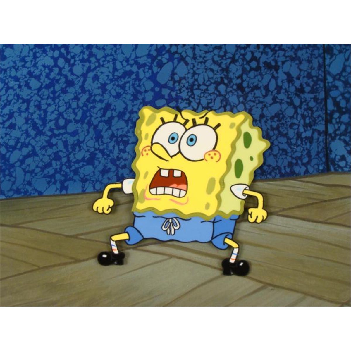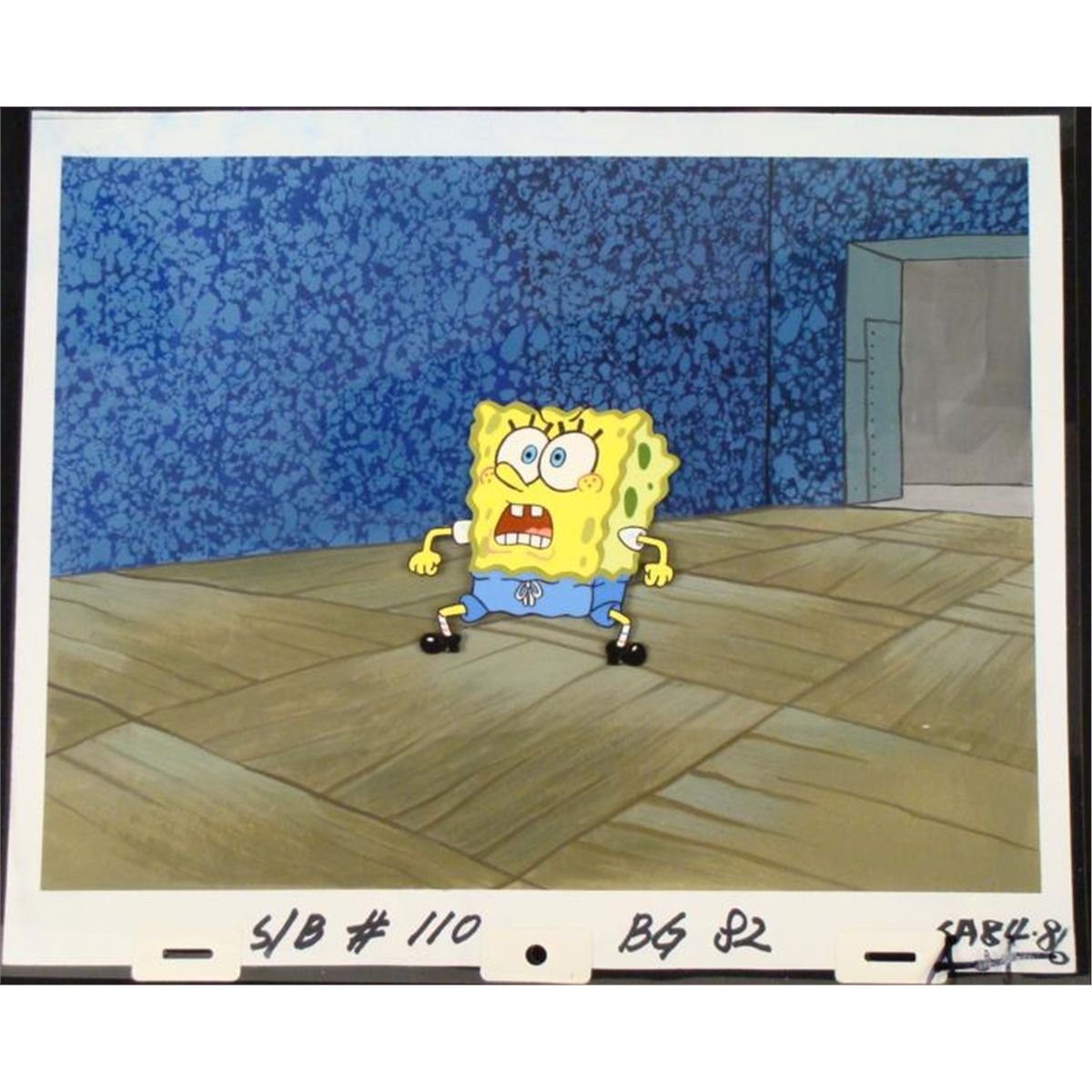 This original hand-painted cel and background is from the Nickelodeon TV show SpongeBob Squarepants. The story takes place under the deep blue sea in Bikini Bottom, where SpongeBob resides. SpongeBob, who is a yellow, porous sponge, is your typical happy-go-lucky character, as he is always cheerful and enjoys making people laugh. Patrick Star, SpongeBob's neighbor who is a starfish, boasts knowing nothing and is often getting himself into ridiculous situations. Between the homes of these two lies the home of the miserable Squidward, a squid, who is known for being grouchy and playing tricks on SpongeBob and Patrick. Both SpongeBob and Squidward work at the Krusty Krab, a fast food business run by the greedy money-loving Mr. Krabs, a crab, the arch rival of the evil, possibly misunderstood, Plankton. Another neighbor, Sandy Cheeks, an athletic squirrel who normally wears an astronaut's space suit, was introduced in "Tea at the Treedome." She spends most of her time inventing and experimenting. Looks like SpongeBob has walked into a dark room and gotten quite a fright! * * Overall Size of Background: 10 1/2" x 14" Overall size of cel: 10 1/2" x 12 1/2"Very good conditionOriginal Production Backgrounds are used in the making of the final version of animated productions. The background establishes the location and the overall good mood of the scene. Typically, a background layout artist creates a drawing to establish the content of the scene, placement of characters, perspective and camera angle. Based on this drawing, the background artist creates a preliminary painting to confirm all of the scenes details, then the final production background which is used in the filming of the scene. When these backgrounds are individually photographed behind the progression of production cels, and projected at a rapid succession, the images in the foreground appear to move, creating an animated scene. * This cel was placed with this background because it appears to go well with it. The bottom of the sheet has peg holes, and the animator's notations. *