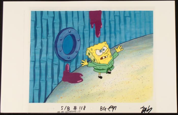 This animation cel and reproduction background are from the Nickelodeon TV show SpongeBob Squarepants. The story takes place under the deep blue sea in Bikini Bottom, where SpongeBob resides. SpongeBob, who is a yellow, porous sponge, is your typical happy-go-lucky character, as he is always cheerful and enjoys making people laugh. Patrick Star, SpongeBob's neighbor who is a starfish, is your average children's show idiot, as he boasts knowing nothing and is often getting himself into ridiculous situations. Between the homes of these two lies the home of the miserable Squidward, a squid, who is known for being grouchy and playing tricks on SpongeBob and Patrick. Both SpongeBob and Squidward work at the Krusty Krab, a fast food business run by the greedy money-loving Mr. Krabs, a crab, the arch rival of the evil, possibly misunderstood, Plankton. Another neighbor, Sandy Cheeks, an athletic squirrel who normally wears an astronaut's space suit, was introduced in "Tea at the Treedome." She spends most of her time inventing and experimenting. SpongeBob has his arms out.Original Printed Background and Animated Cel Overall Size of Background: 11" x 17" Overall Size of the Cel: 10 1/2" x 12 1/2" Very good condition This is an original hand-painted cel set-up used in the production of an episode of "SpongeBob SquarePants." Each one-of-a-kind set-up represents a slight change in position of the characters. When individually photographed and projected in rapid succession, the images appear to move.