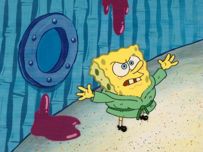 This animation cel and reproduction background are from the Nickelodeon TV show SpongeBob Squarepants. The story takes place under the deep blue sea in Bikini Bottom, where SpongeBob resides. SpongeBob, who is a yellow, porous sponge, is your typical happy-go-lucky character, as he is always cheerful and enjoys making people laugh. Patrick Star, SpongeBob's neighbor who is a starfish, is your average children's show idiot, as he boasts knowing nothing and is often getting himself into ridiculous situations. Between the homes of these two lies the home of the miserable Squidward, a squid, who is known for being grouchy and playing tricks on SpongeBob and Patrick. Both SpongeBob and Squidward work at the Krusty Krab, a fast food business run by the greedy money-loving Mr. Krabs, a crab, the arch rival of the evil, possibly misunderstood, Plankton. Another neighbor, Sandy Cheeks, an athletic squirrel who normally wears an astronaut's space suit, was introduced in "Tea at the Treedome." She spends most of her time inventing and experimenting. SpongeBob has his arms out.Original Printed Background and Animated Cel Overall Size of Background: 11" x 17" Overall Size of the Cel: 10 1/2" x 12 1/2" Very good condition This is an original hand-painted cel set-up used in the production of an episode of "SpongeBob SquarePants." Each one-of-a-kind set-up represents a slight change in position of the characters. When individually photographed and projected in rapid succession, the images appear to move.