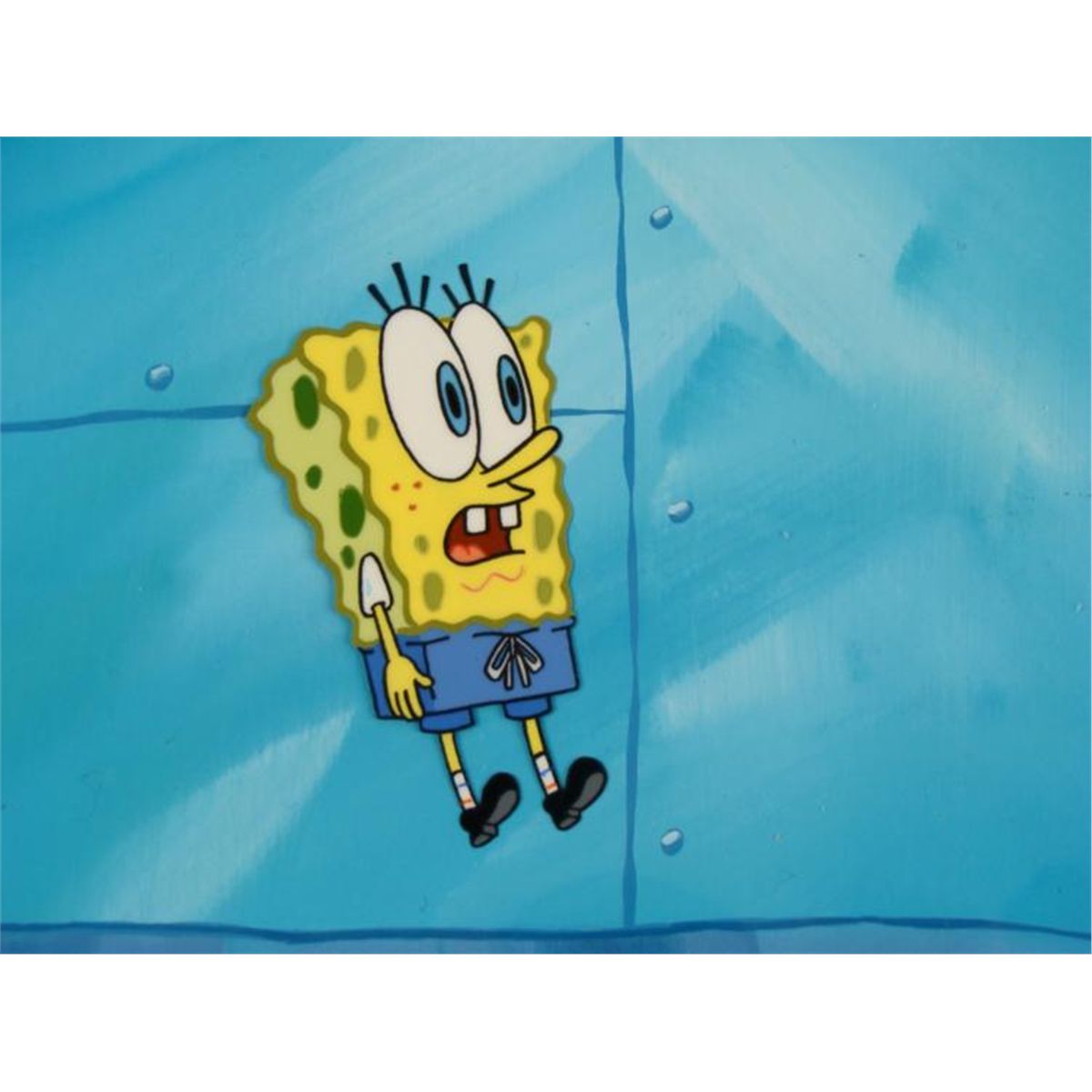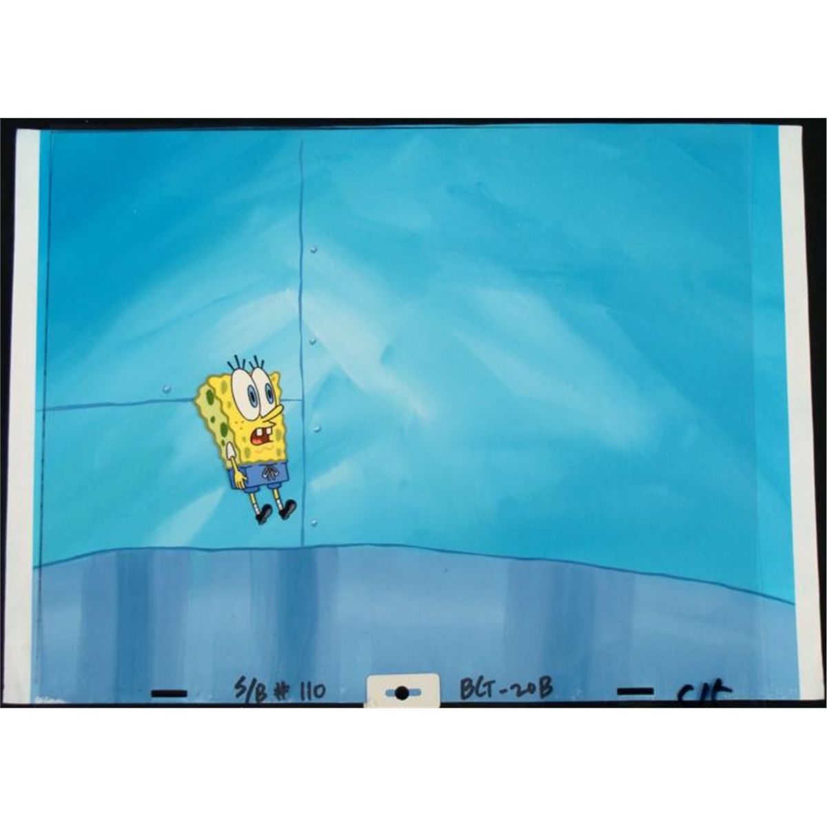 This original hand-painted cel and background is from the Nickelodeon TV show SpongeBob Squarepants. The story takes place under the deep blue sea in Bikini Bottom, where SpongeBob resides. SpongeBob, who is a yellow, porous sponge, is your typical happy-go-lucky character, as he is always cheerful and enjoys making people laugh. Patrick Star, SpongeBob's neighbor who is a starfish, boasts knowing nothing and is often getting himself into ridiculous situations. Between the homes of these two lies the home of the miserable Squidward, a squid, who is known for being grouchy and playing tricks on SpongeBob and Patrick. Both SpongeBob and Squidward work at the Krusty Krab, a fast food business run by the greedy money-loving Mr. Krabs, a crab, the arch rival of the evil, possibly misunderstood, Plankton. Another neighbor, Sandy Cheeks, an athletic squirrel who normally wears an astronaut's space suit, was introduced in "Tea at the Treedome." She spends most of her time inventing and experimenting. * SpongeBob has had quite a fright, and he's jumping right up in the air! * * Overall Size of Background: 10 1/2" x 14" Overall size of cel: 10 1/2" x 12 1/2"Very good conditionOriginal Production Backgrounds are used in the making of the final version of animated productions. The background establishes the location and the overall good mood of the scene. Typically, a background layout artist creates a drawing to establish the content of the scene, placement of characters, perspective and camera angle. Based on this drawing, the background artist creates a preliminary painting to confirm all of the scenes details, then the final production background which is used in the filming of the scene. When these backgrounds are individually photographed behind the progression of production cels, and projected at a rapid succession, the images in the foreground appear to move, creating an animated scene. * This cel was placed with this background because it appears to go well with it. The bottom of the sheet has peg holes, and the animator's notations. *