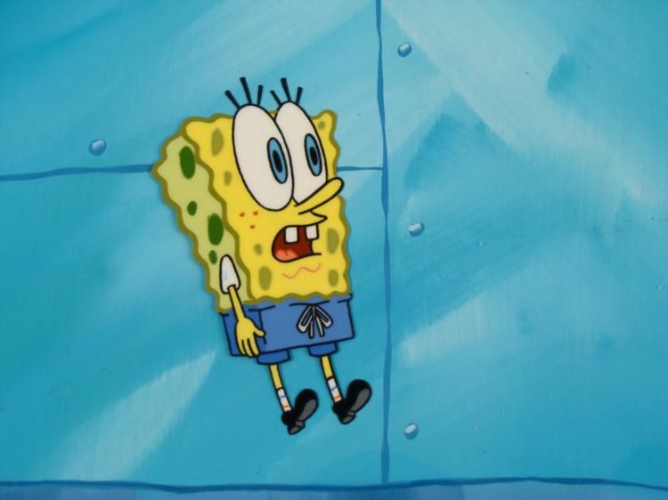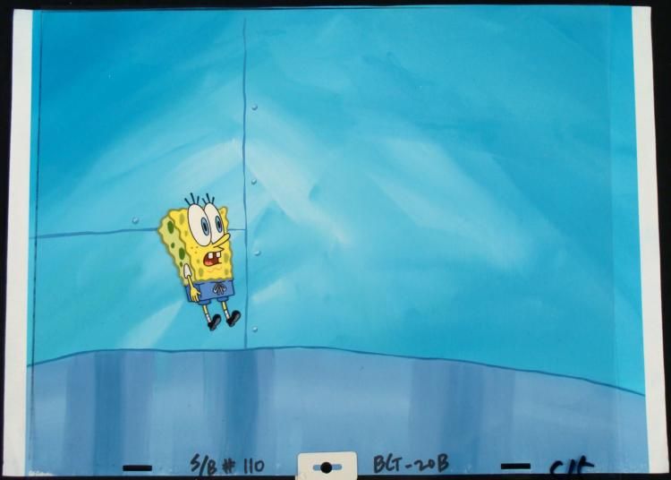 This original hand-painted cel and background is from the Nickelodeon TV show SpongeBob Squarepants. The story takes place under the deep blue sea in Bikini Bottom, where SpongeBob resides. SpongeBob, who is a yellow, porous sponge, is your typical happy-go-lucky character, as he is always cheerful and enjoys making people laugh. Patrick Star, SpongeBob's neighbor who is a starfish, boasts knowing nothing and is often getting himself into ridiculous situations. Between the homes of these two lies the home of the miserable Squidward, a squid, who is known for being grouchy and playing tricks on SpongeBob and Patrick. Both SpongeBob and Squidward work at the Krusty Krab, a fast food business run by the greedy money-loving Mr. Krabs, a crab, the arch rival of the evil, possibly misunderstood, Plankton. Another neighbor, Sandy Cheeks, an athletic squirrel who normally wears an astronaut's space suit, was introduced in "Tea at the Treedome." She spends most of her time inventing and experimenting. * SpongeBob has had quite a fright, and he's jumping right up in the air! * * Overall Size of Background: 10 1/2" x 14" Overall size of cel: 10 1/2" x 12 1/2"Very good conditionOriginal Production Backgrounds are used in the making of the final version of animated productions. The background establishes the location and the overall good mood of the scene. Typically, a background layout artist creates a drawing to establish the content of the scene, placement of characters, perspective and camera angle. Based on this drawing, the background artist creates a preliminary painting to confirm all of the scenes details, then the final production background which is used in the filming of the scene. When these backgrounds are individually photographed behind the progression of production cels, and projected at a rapid succession, the images in the foreground appear to move, creating an animated scene. * This cel was placed with this background because it appears to go well with it. The bottom of the sheet has peg holes, and the animator's notations. *