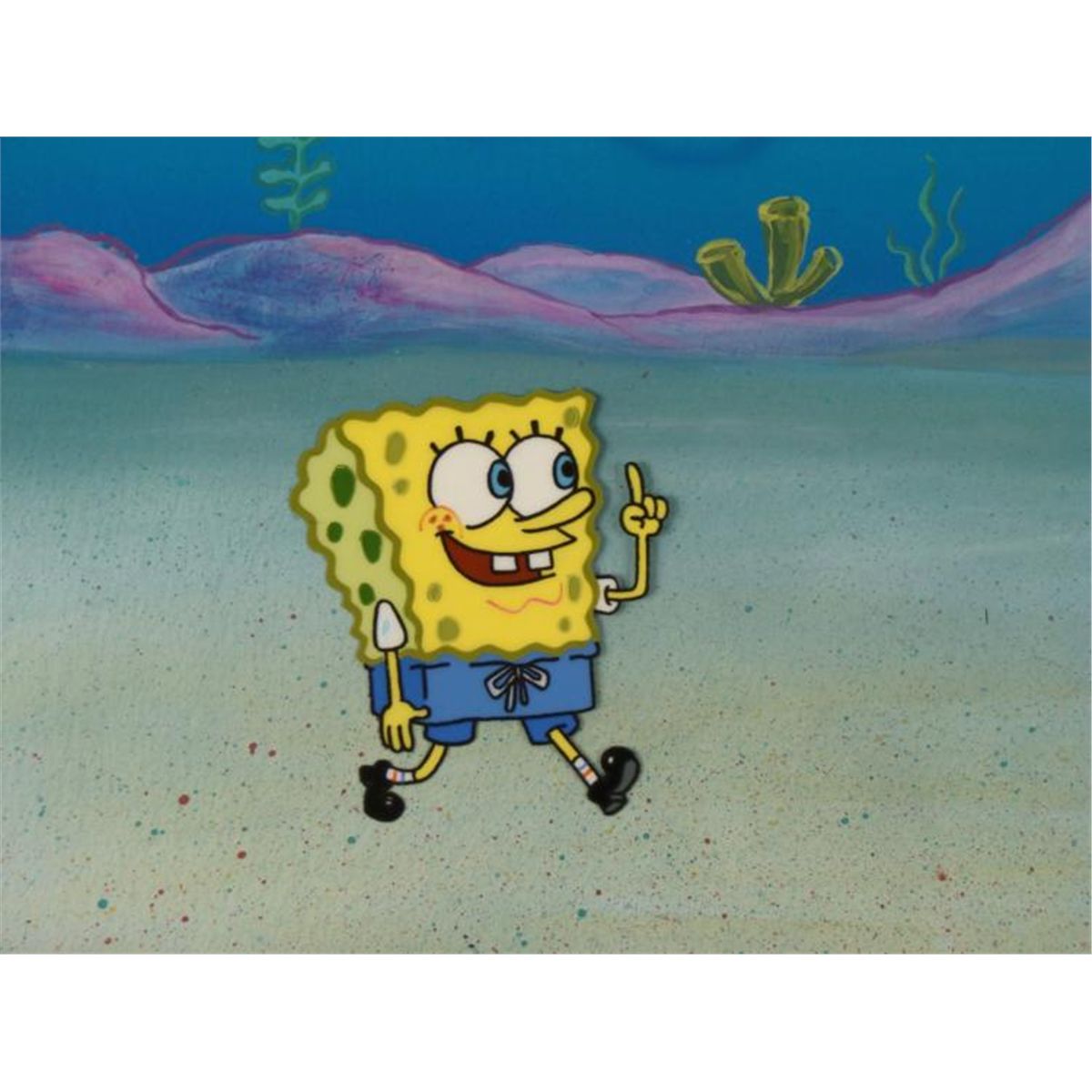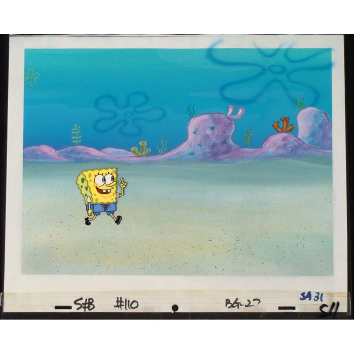 This original hand-painted cel and background is from the Nickelodeon TV show SpongeBob Squarepants. The story takes place under the deep blue sea in Bikini Bottom, where SpongeBob resides. SpongeBob, who is a yellow, porous sponge, is your typical happy-go-lucky character, as he is always cheerful and enjoys making people laugh. Patrick Star, SpongeBob's neighbor who is a starfish, boasts knowing nothing and is often getting himself into ridiculous situations. Between the homes of these two lies the home of the miserable Squidward, a squid, who is known for being grouchy and playing tricks on SpongeBob and Patrick. Both SpongeBob and Squidward work at the Krusty Krab, a fast food business run by the greedy money-loving Mr. Krabs, a crab, the arch rival of the evil, possibly misunderstood, Plankton. Another neighbor, Sandy Cheeks, an athletic squirrel who normally wears an astronaut's space suit, was introduced in "Tea at the Treedome." She spends most of her time inventing and experimenting. Here's SpongeBob making his entrance in the scene on this nice day. * * Overall Size of Background: 10 1/2" x 14" Overall size of cel: 10 1/2" x 12 1/2"Very good conditionOriginal Production Backgrounds are used in the making of the final version of animated productions. The background establishes the location and the overall good mood of the scene. Typically, a background layout artist creates a drawing to establish the content of the scene, placement of characters, perspective and camera angle. Based on this drawing, the background artist creates a preliminary painting to confirm all of the scenes details, then the final production background which is used in the filming of the scene. When these backgrounds are individually photographed behind the progression of production cels, and projected at a rapid succession, the images in the foreground appear to move, creating an animated scene. * This cel was placed with this background because it appears to go well with it. The bottom of the sheet has peg holes, and the animator's notations. *