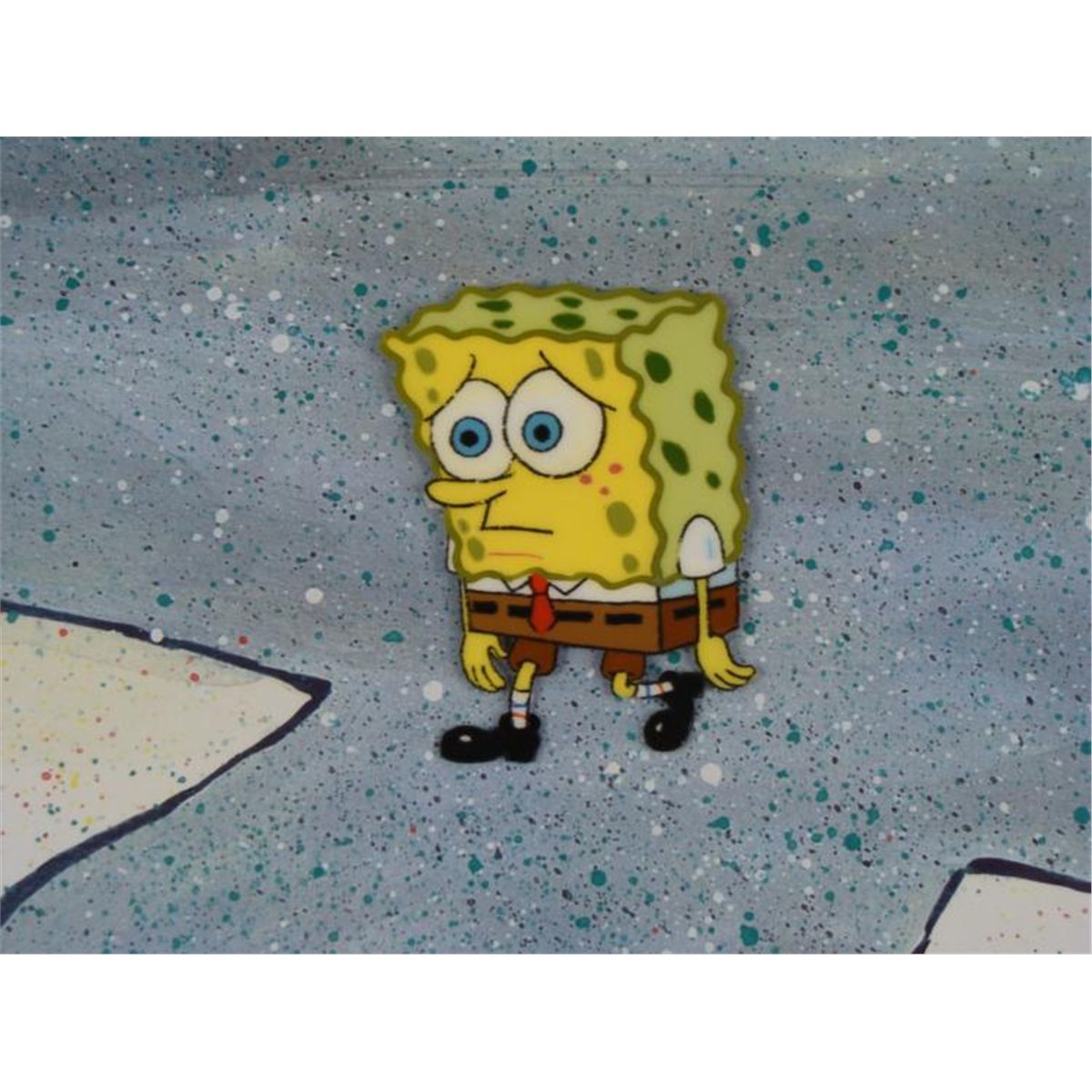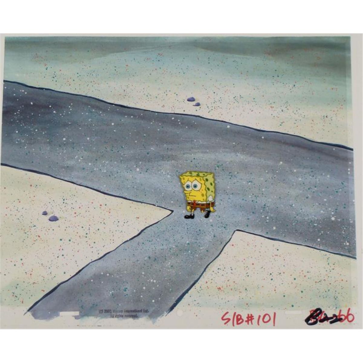 This original hand-painted cel with reproduction background is from the Nickelodeon TV show SpongeBob Squarepants. The story takes place under the deep blue sea in Bikini Bottom, where SpongeBob resides. SpongeBob, who is a yellow, porous sponge, is your typical happy-go-lucky character, as he is always cheerful and enjoys making people laugh. Patrick Star, SpongeBob's neighbor who is a starfish, boasts knowing nothing and is often getting himself into ridiculous situations. Between the homes of these two lies the home of the miserable Squidward, a squid, who is known for being grouchy and playing tricks on SpongeBob and Patrick. Both SpongeBob and Squidward work at the Krusty Krab, a fast food business run by the greedy money-loving Mr. Krabs, a crab, the arch rival of the evil, possibly misunderstood, Plankton. Another neighbor, Sandy Cheeks, an athletic squirrel who normally wears an astronaut's space suit, was introduced in "Tea at the Treedome." She spends most of her time inventing and experimenting. SpongeBob sure looks lonely walking down the road. Hopefully he'll find a friend. * * Overall Size of Background: 11" x 17" Overall size of cel: 10 1/2" x 12 1/2"Very good conditionOriginal Production Backgrounds are used in the making of the final version of animated productions. The background establishes the location and the overall good mood of the scene. Typically, a background layout artist creates a drawing to establish the content of the scene, placement of characters, perspective and camera angle. Based on this drawing, the background artist creates a preliminary painting to confirm all of the scenes details, then the final production background which is used in the filming of the scene. When these backgrounds are individually photographed behind the progression of production cels, and projected at a rapid succession, the images in the foreground appear to move, creating an animated scene. * This cel was placed with this background because it appears to go well with it. The bottom of the sheet has peg holes, and the animator's notations. *