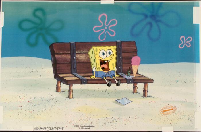 This animation cel and reproduction background are from the Nickelodeon TV show SpongeBob Squarepants. The story takes place under the deep blue sea in Bikini Bottom, where SpongeBob resides. SpongeBob, who is a yellow, porous sponge, is your typical happy-go-lucky character, as he is always cheerful and enjoys making people laugh. Patrick Star, SpongeBob's neighbor who is a starfish, is your average children's show idiot, as he boasts knowing nothing and is often getting himself into ridiculous situations. Between the homes of these two lies the home of the miserable Squidward, a squid, who is known for being grouchy and playing tricks on SpongeBob and Patrick. Both SpongeBob and Squidward work at the Krusty Krab, a fast food business run by the greedy money-loving Mr. Krabs, a crab, the arch rival of the evil, possibly misunderstood, Plankton. Another neighbor, Sandy Cheeks, an athletic squirrel who normally wears an astronaut's space suit, was introduced in "Tea at the Treedome." She spends most of her time inventing and experimenting. SpongeBob and Plankton are eatting ice creamOriginal Printed Background and Animated Cel Overall Size of Background: 11" x 17" Overall Size of the Cel: 11" x 16 1/2" Very good condition This is an original hand-painted cel set-up used in the production of an episode of "SpongeBob SquarePants." Each one-of-a-kind set-up represents a slight change in position of the characters. When individually photographed and projected in rapid succession, the images appear to move.