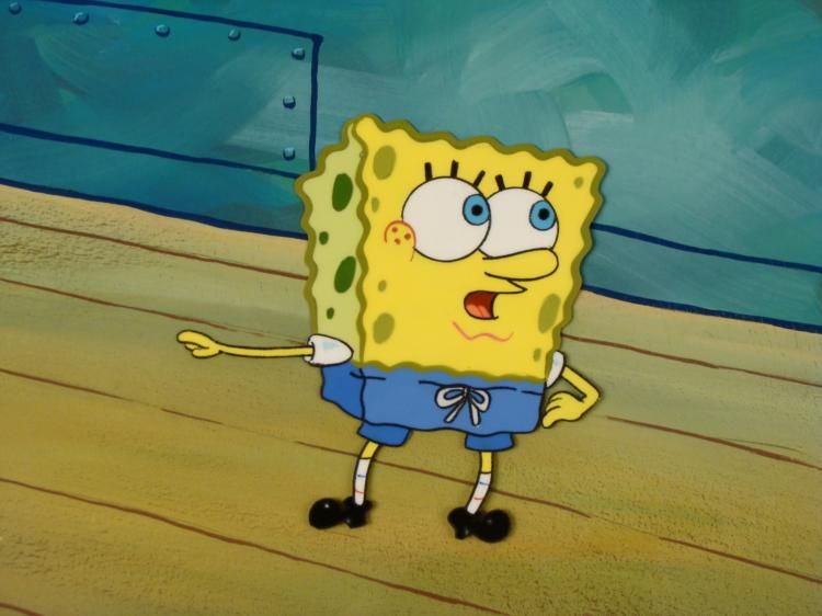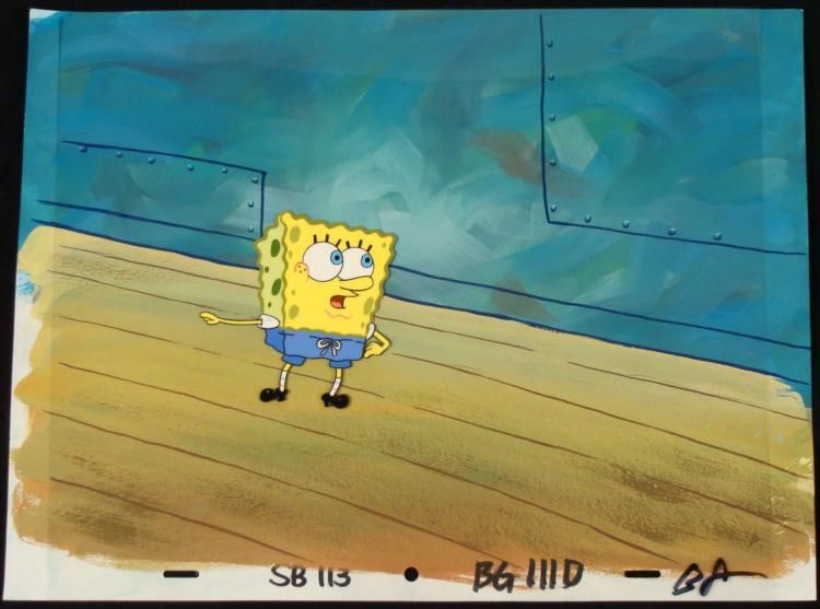 This original hand-painted cel and background is from the Nickelodeon TV show SpongeBob Squarepants. The story takes place under the deep blue sea in Bikini Bottom, where SpongeBob resides. SpongeBob, who is a yellow, porous sponge, is your typical happy-go-lucky character, as he is always cheerful and enjoys making people laugh. Patrick Star, SpongeBob's neighbor who is a starfish, boasts knowing nothing and is often getting himself into ridiculous situations. Between the homes of these two lies the home of the miserable Squidward, a squid, who is known for being grouchy and playing tricks on SpongeBob and Patrick. Both SpongeBob and Squidward work at the Krusty Krab, a fast food business run by the greedy money-loving Mr. Krabs, a crab, the arch rival of the evil, possibly misunderstood, Plankton. Another neighbor, Sandy Cheeks, an athletic squirrel who normally wears an astronaut's space suit, was introduced in "Tea at the Treedome." She spends most of her time inventing and experimenting. Squidward appears to be in a good mood here in this pleasantly colored setting. * * Overall Size of Background: 10 1/2" x 14" Overall size of cel: 10 1/2" x 12 1/2"Very good conditionOriginal Production Backgrounds are used in the making of the final version of animated productions. The background establishes the location and the overall good mood of the scene. Typically, a background layout artist creates a drawing to establish the content of the scene, placement of characters, perspective and camera angle. Based on this drawing, the background artist creates a preliminary painting to confirm all of the scenes details, then the final production background which is used in the filming of the scene. When these backgrounds are individually photographed behind the progression of production cels, and projected at a rapid succession, the images in the foreground appear to move, creating an animated scene. * This cel was placed with this background because it appears to go well with it. The bottom of the sheet has peg holes, and the animator's notations. *